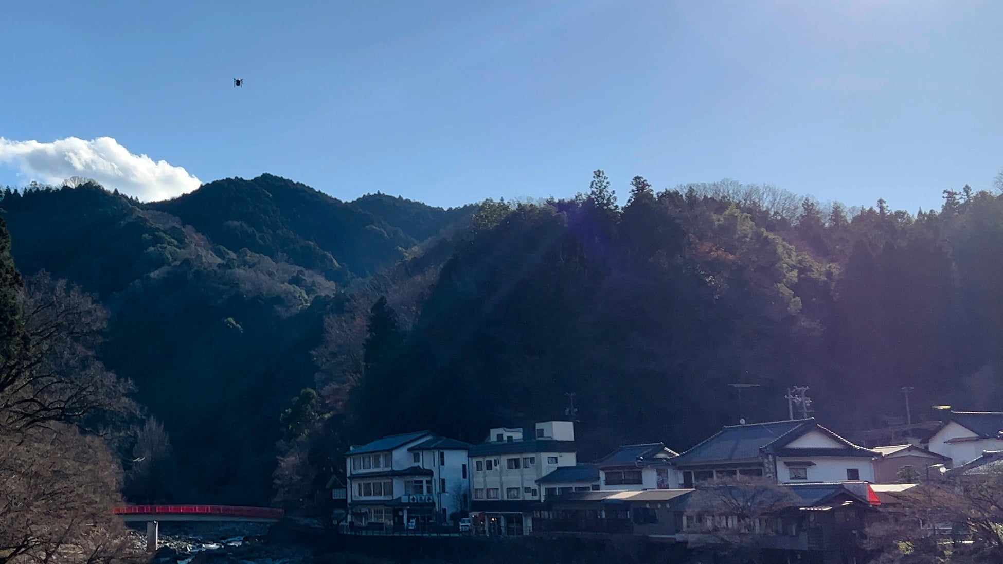 愛知県豊田市の足助町にある香嵐渓は、美しい紅葉を見るために毎年多くの観光客が訪れる観光名所です。南北を山に囲まれ、足助川・巴川に挟まれているという立地特性があり、自然災害が起きた際に、橋が没落してしまうと孤立する恐れがあります。このような有事を想定し、当社の物流ドローン『SkyLift』を活用し、医療物資等を運搬する実証実験を実施いたしました。