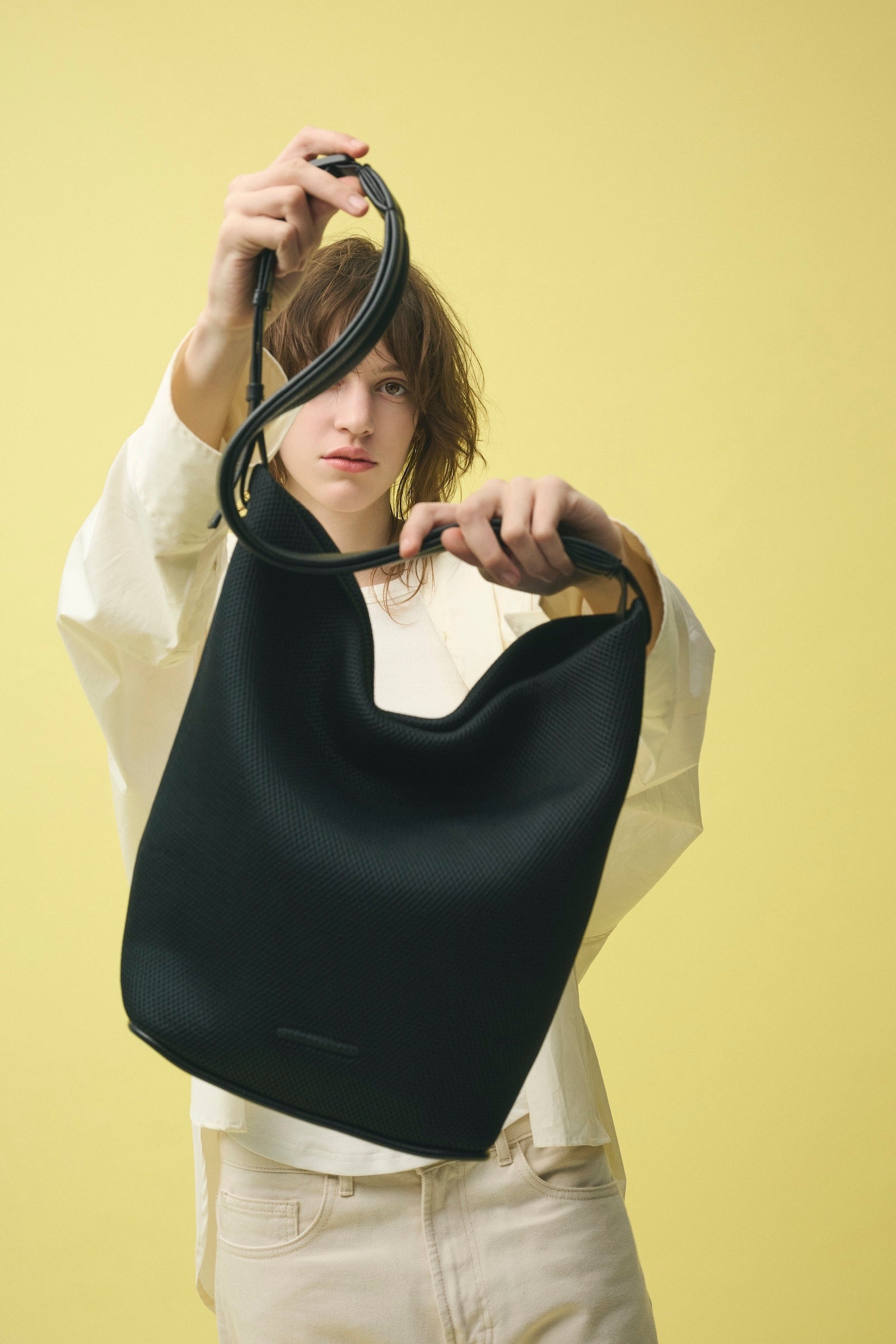 3層構造のダブルラッセルメッシュをメイン素材に採用した「メッシュトート・ホーボー」は、メッシュトートで約280gという驚くほどの軽さと優れた通気性が特徴のシリーズです。ストラップ部分にレザーを配することで、スポーティーさのあるメッシュの印象を程よく引き締め、大人のスタイルにも馴染むデザインに仕上げました。