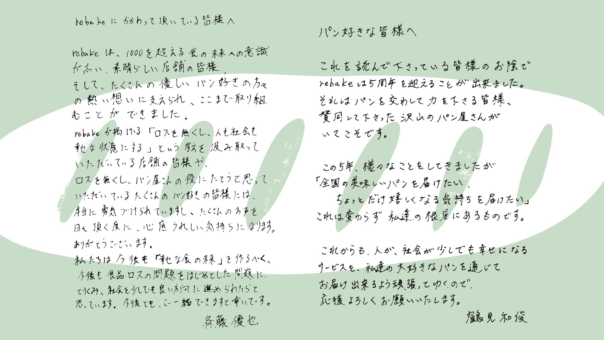 上記のように、現在では多くの方にご利用いただき、フードロス削減にも取り組んでいるrebakeですが、現在に至るまでは多くの苦難がありました。創業時は現在のような通信販売だけで営業するには十分な顧客も資金も得られず、社会に貢献することはおろか、自分達の活動の存続自体が危ぶまれたこともありました。一部の方からは「廃棄になりそうなもので金儲けをするなんて」と非難されたり、パン屋さんの側からは「ロスが出る店だと思われたくない」という理由でなかなかご協力いただけない、という経験も少なくありませんでした。簡単な道のりではございませんでしたが、苦難に出会うその度に、我々の活動目標である「人にも、食べものにも幸せな一生をお届けしたい」という趣旨をお伝えしてまいりました。その結果、5年間にわたり活動を広げて来ることができました。rebakeのサービスを通して理念に共感を示してくださっている利用者の方々に、改めて感謝申し上げます。