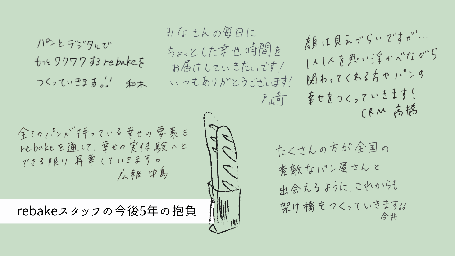 上記のように、我々は「人にも食べ物にも幸せな一生を」をモットーに日々活動しています。通販サイトであるため、スタッフの顔は見えづらいですが、利用者の方やパン屋さんなどrebakeに関わっているすべての人の幸せを作ることが、今までもこれからも私たちの目標です。