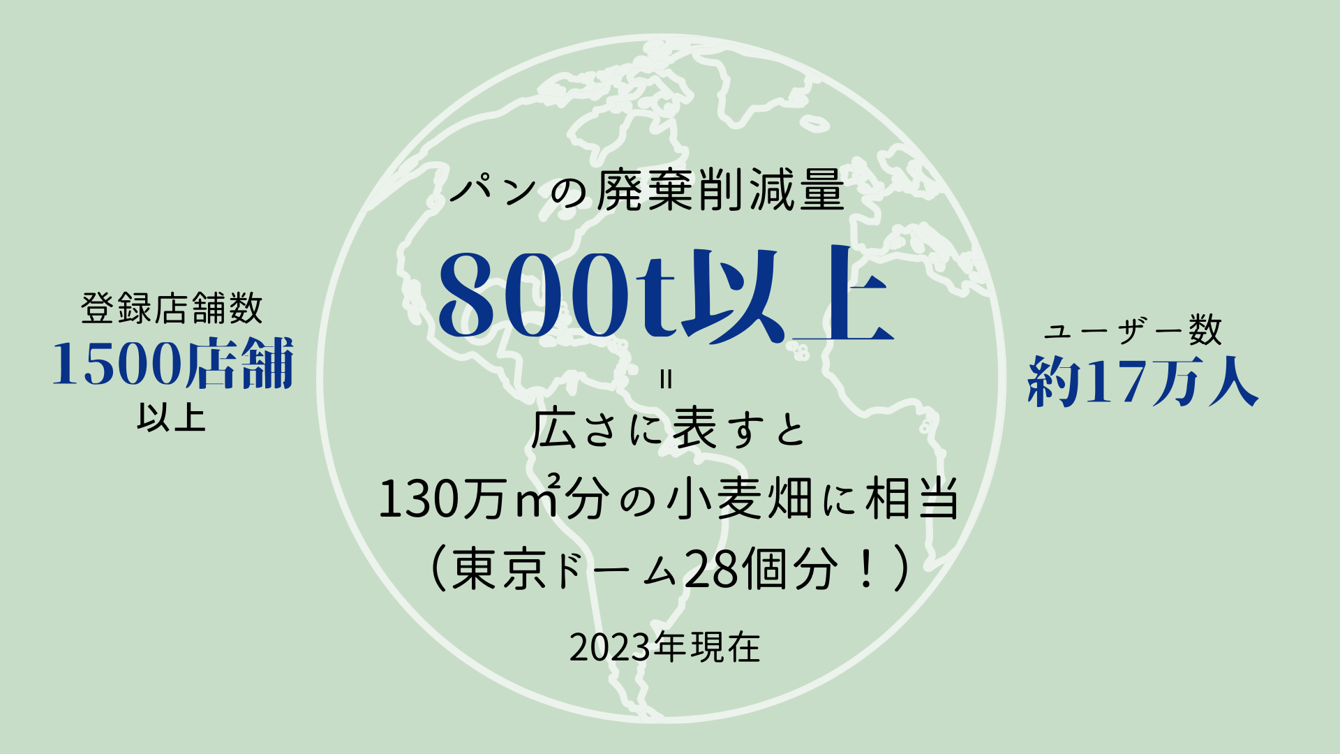 rebakeは、2018年10⽉にサービスを開始してから、今年の10月で5周年を迎えました。2023年8月の時点で、800t以上のロスパンが、rebakeを通して消費者の元に運ばれています。これは、パンの原料である小麦で表すと、東京ドーム約35個分の130万㎡で収穫された小麦を捨てずに消費したことになります。