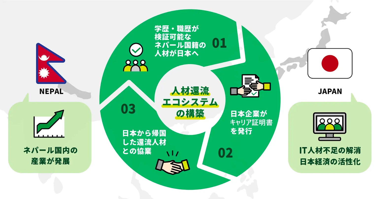 日本で働く人材に世界共通の個人IDを作成し“在留カード”と連携。就学・就労・スキルに関する証明書を発行・管理するシステム開発により、入国前から帰国後までの「信頼ある人材還流エコシステム」創出を目指す。