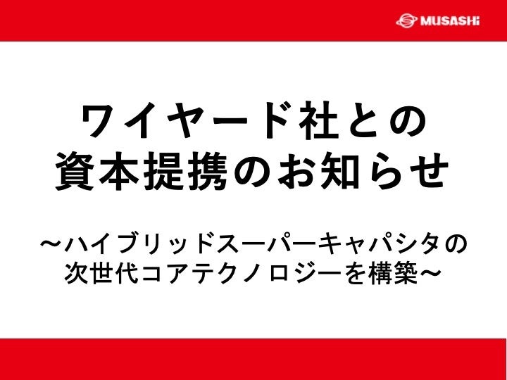 ワイヤード社との資本提携による協業を通じ、ワイヤード社の従来の経営方針を維持し既存事業の維持・拡大を図りつつ、ムサシにおけるレーザー技術の幅広い領域での適用を推進するとともに、特に今後に需要の拡大が期待されているハイブリッドスーパーキャパシタにおいて必須となる次世代コアテクノロジーの構築を一体となって進めてまいります。両社間ではさらに、グローバル市場での新たなニーズに対する競争力を高めるため、両社の技術シナジーによるソリューション事業展開を目指していきます。