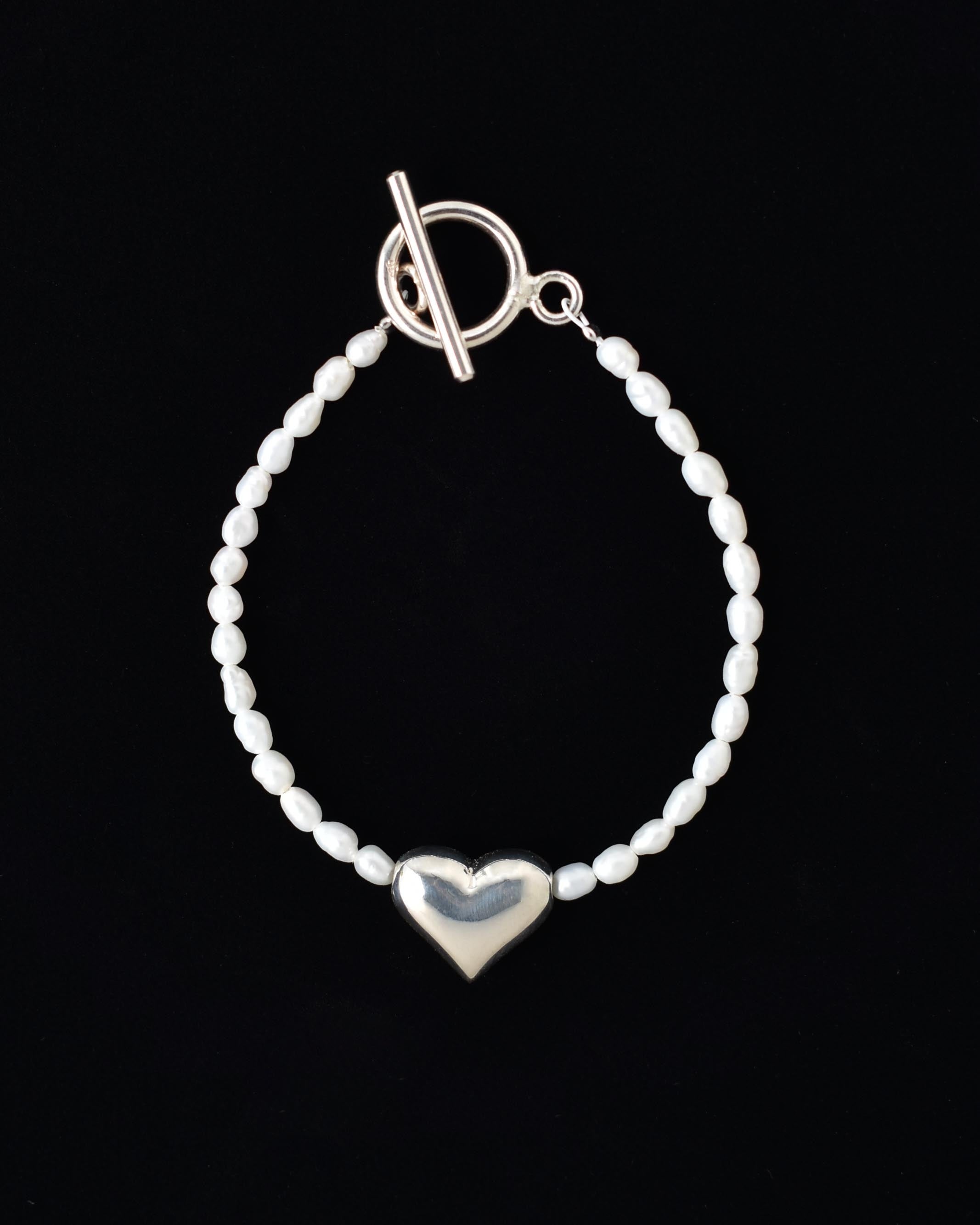 淡水パールの澄んだ艶が透明感を添え、シャープなシルバー925の光沢を纏ったハートがデコルテにモダンな存在感を放ちます。
