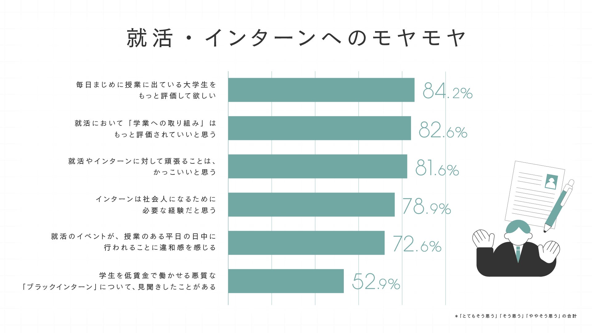 一方、大学生活のメインである学業と、大学生活の先に待つ就活への繋がりについては疑問を感じる声も。「真面目に授業に出ている大学生を評価してほしい」(84.2%)、「就活において、学業への取り組みはもっと評価されてもいい」(82.6%)という回答が上位に上がっています。勉強を頑張りたいと思う一方で、“就活に有利になるわけではない”という大学生の本音が垣間見える結果となりました。