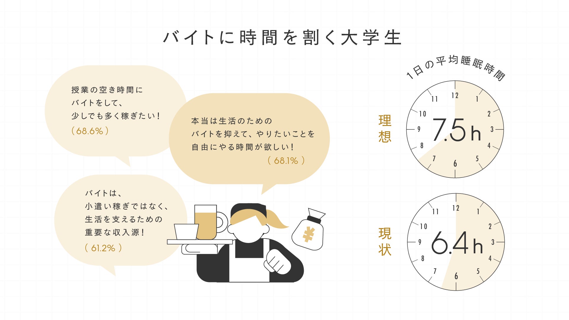 一方、学生生活で最も大事にしたいことを聞いてみると、「アルバイト」は11位(3.6%)という低い結果に。上位には1位「友人・先輩との交流」(18.4%)に続き、2位に「勉学スキルの向上」(13.7%)がランクインし、アルバイトやサークルなどよりも勉強を大切に思っているという結果も明らかとなり、現状と理想のギャップが浮き彫りになりました。さらに、睡眠時間についても聞いてみると、1日の理想の睡眠時間は平均で約7.5時間であるのに対し、実際の1日の睡眠時間は平均で約6.4時間と約1時間も不足していることが判明。忙しさを感じる大学生の実態としては、アルバイトに多くの時間が割かれていて、睡眠時間も足りていない現状があるようです。