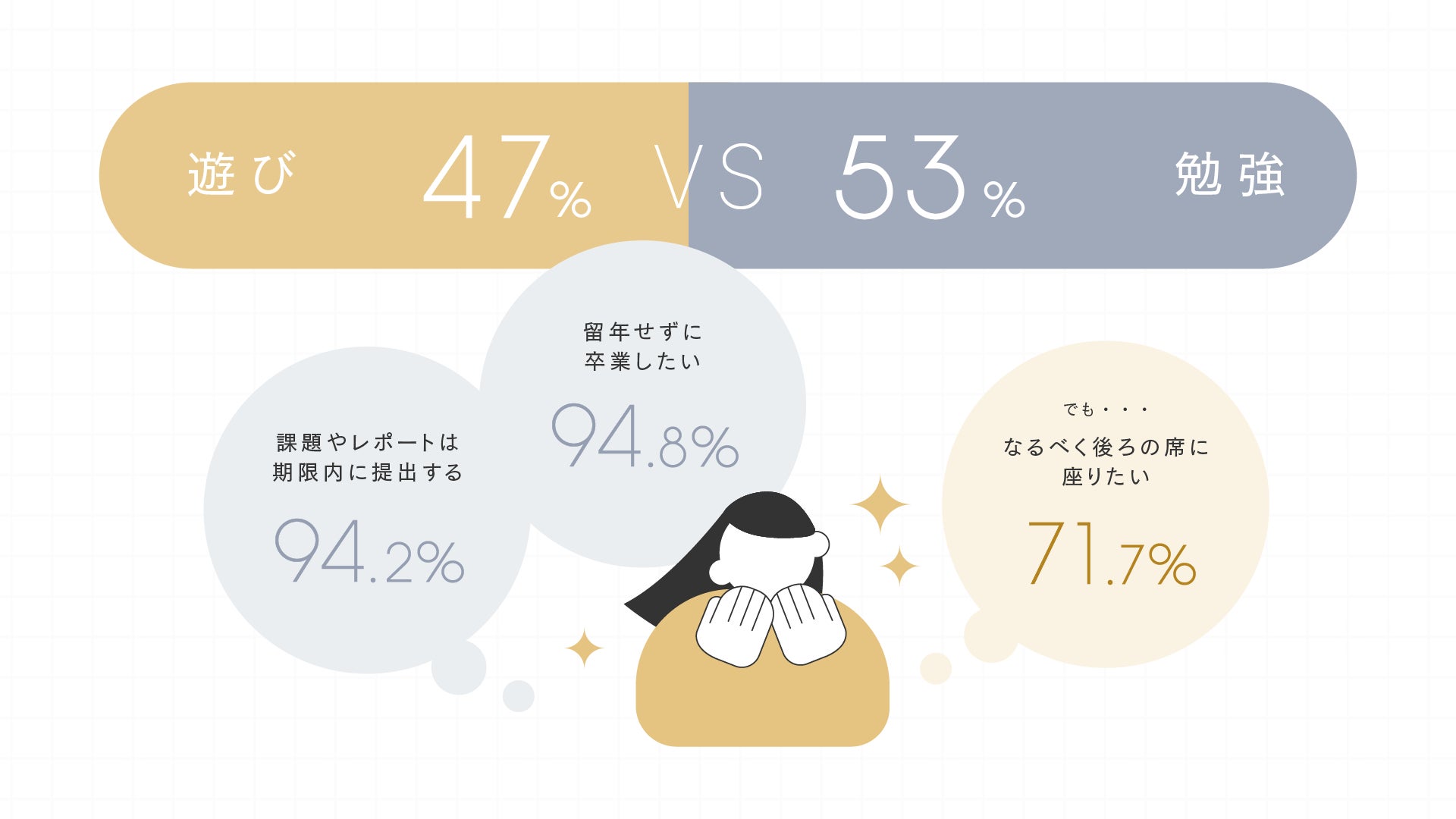 半数以上が「遊び」よりも「勉強」を重視。「なるべく後ろの席に座りたい」けど、「勉強に打ち込む大学生を尊敬」という回答は9割近くも