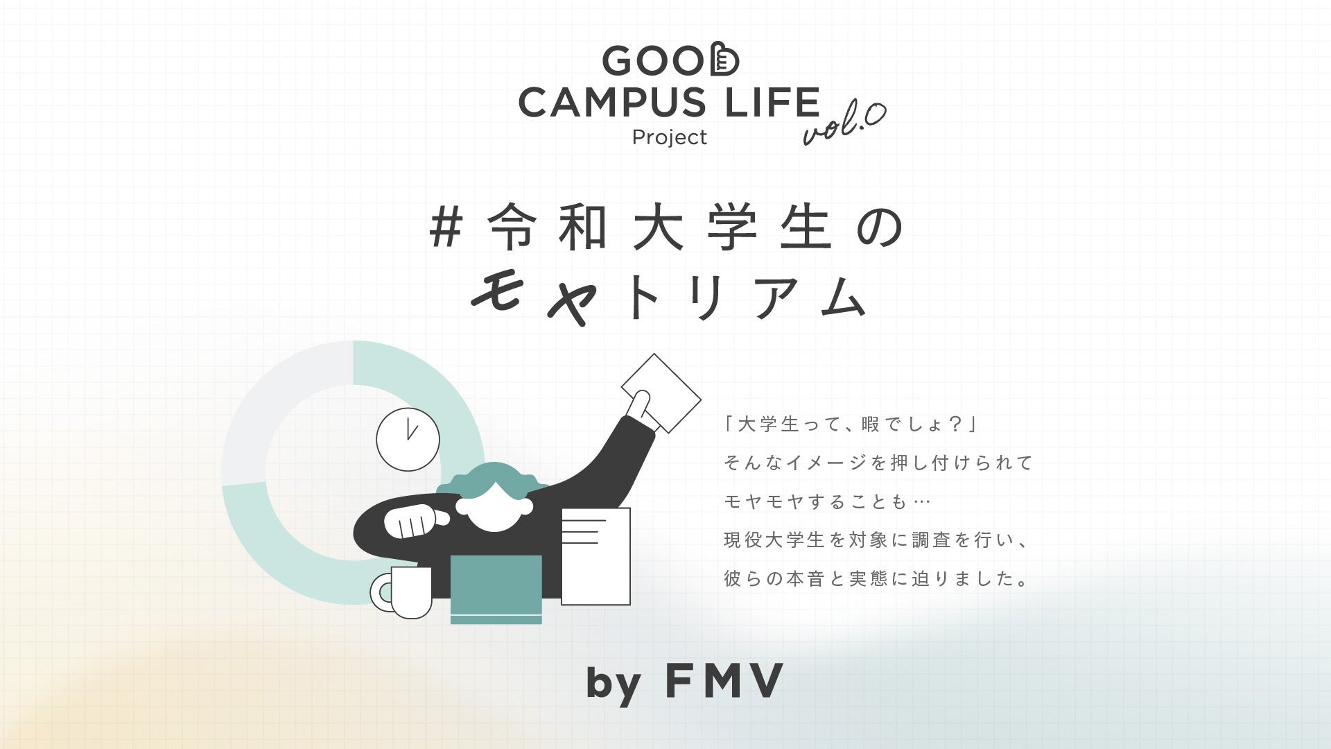 大学生のがんばる時間を応援する新プロジェクト「GOOD CAMPUS LIFE Project」は、コロナ禍を経て大きく変化した現代のキャンパスライフにおいて、世間の想像以上に忙しい大学生の現状を背景にスタートしたFMVの新たな取り組みです。FMVは過去数年間に渡って、様々な取り組みの中で大学生と共に歩んできましたが、改めて今、大学生と向き合い、調査やインタビューをした結果、彼らが大学生活に全力で向き合っている姿が明らかになりました。本プロジェクトを通して、FMVは今後もがんばる大学生を様々な面から応援する活動を続けてまいります。サイトURL:https://www.fmworld.net/fmv/project/goodcampus
