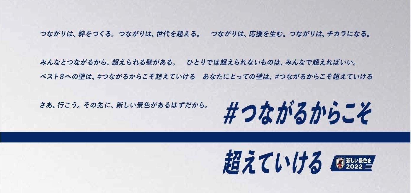 本キャンペーンのコピー/コンセプトである「#つながるからこそ超えていける」は、1人では超えることが難しい壁も、人と人とがつながることで超えられる、応援を通じて選手とファンが世代を超えてつながることでチカラとなり、ベスト8の壁を超えていけるという思いが込められています。