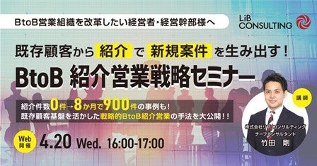 株式会社リブ・コンサルティング(本社:東京都千代田区、代表取締役:関厳)は、BtoB企業経営者・経営幹部様を対象とした、『「既存顧客から「紹介」で「新規案件」を生み出す!<BtoB 紹介営業戦略セミナー>』を2022年4月20日(水)にオンラインにて開催します。