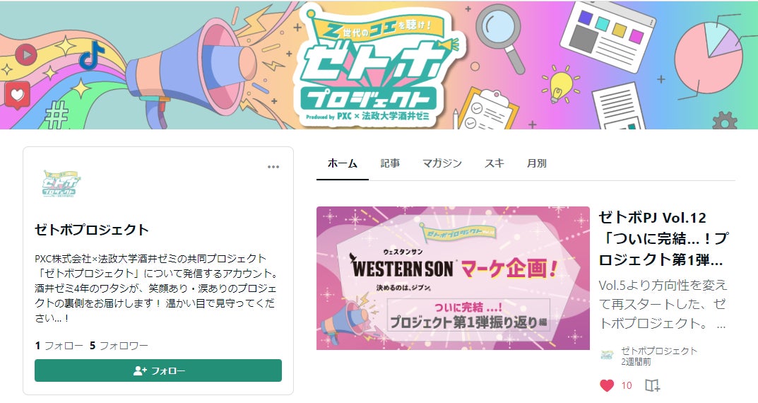 第一弾のゼトボプロジェクトは、法政大学酒井ゼミに所属する学生による「ウェスタンサンウォッカ」を盛り上げるための企画会議から開始。「Z世代がオンラインストアで買いたくなる仕掛けを作りたい!」というテーマを基に、学生達が独自に考えたアイデアやプロジェクトの成り行きを、noteを通じて毎週配信しました(全12回)