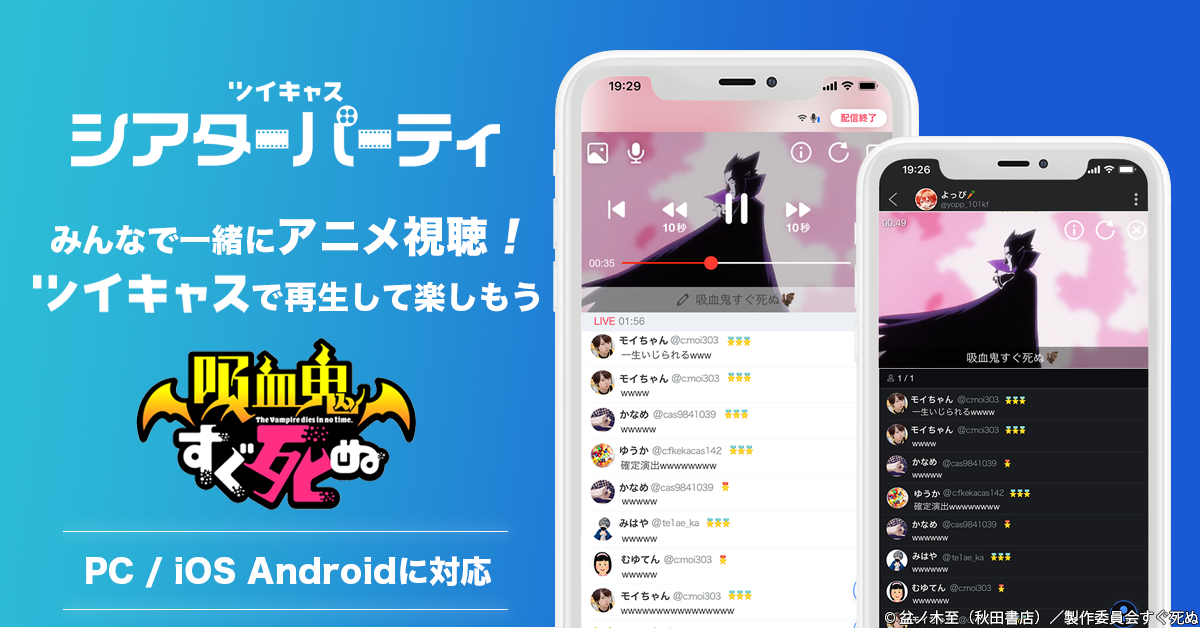 モイ株式会社(本社:東京都千代田区 代表:赤松 洋介)は、同社が運営するライブ配信プラットフォーム「ツイキャス」にて、2022年3月5日(土)21:00よりTVアニメ「吸血鬼すぐ死ぬ」全12話を3週連続で上映することをお知らせいたします。