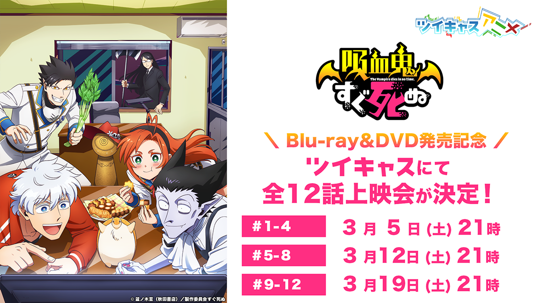 今回、ツイキャスアニメでは、TVアニメ「吸血鬼すぐ死ぬ」のBD発売を記念して、BD vol.1 から vol.3 に収録の、第1話から第12話までを3週連続で放送いたします。