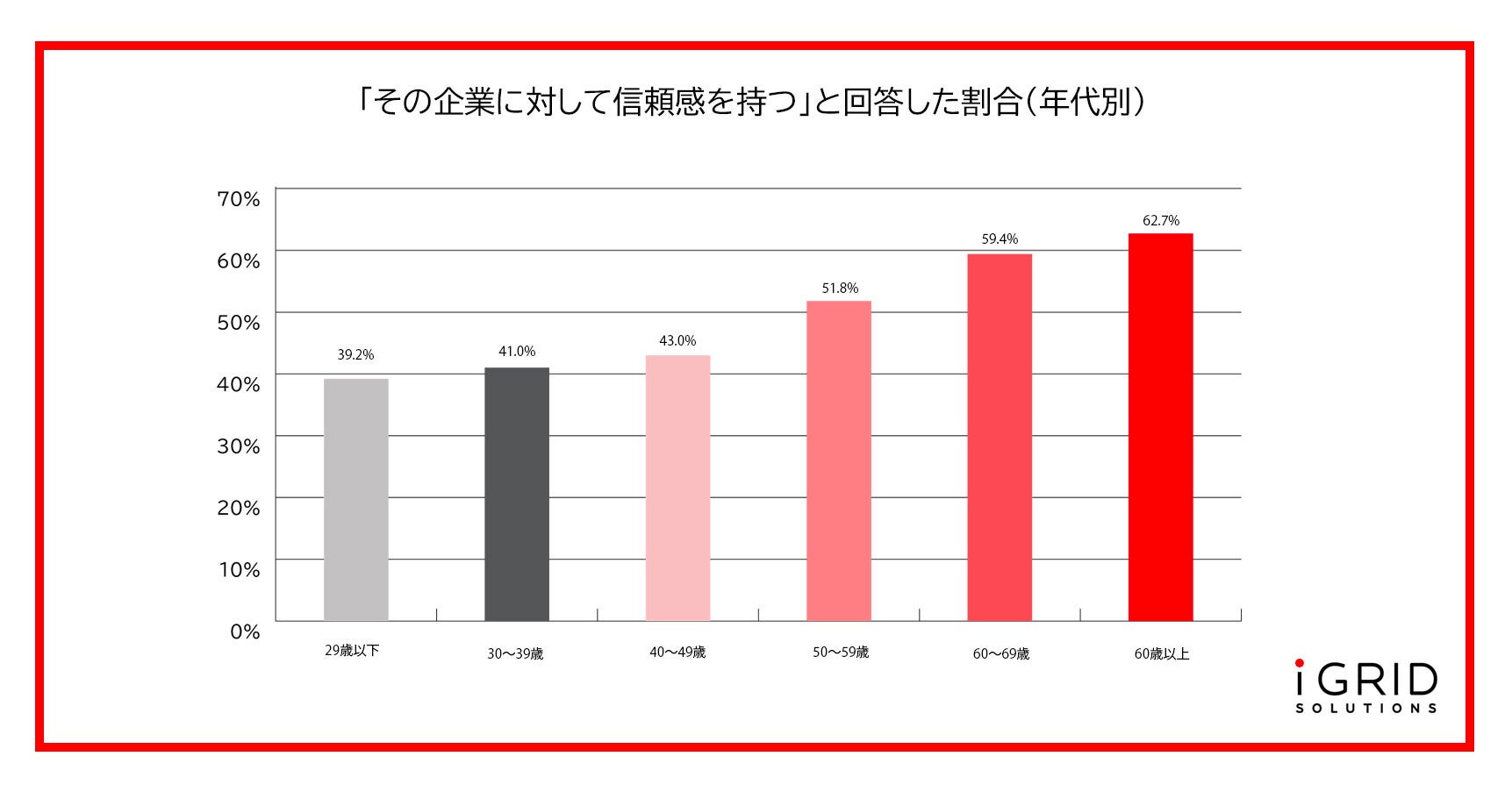 また、「その企業に対して信頼感を持つ」の回答項目に対して、年齢別で集計してみたところ、年齢が上がるにつれて信頼度を持つと回答した人の割合が高くなっていることがわかりました。