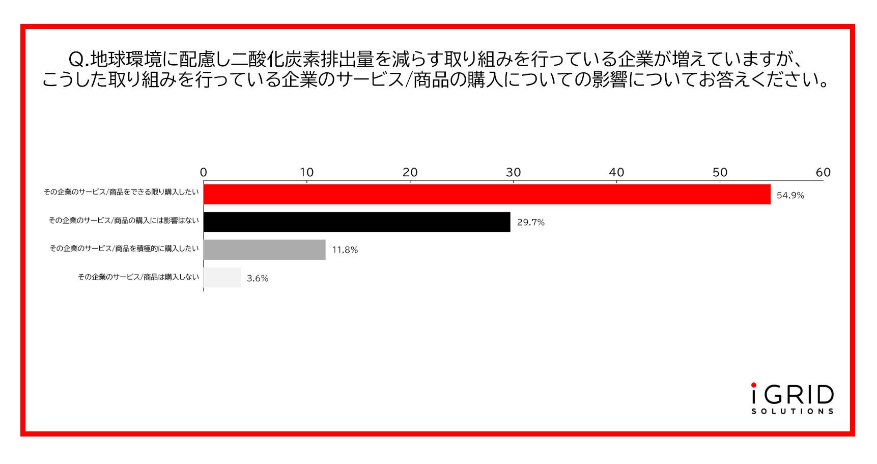 さらに、「地球環境に配慮し二酸化炭素排出量を減らす取り組みを行っている企業が増えていますが、こうした取り組みを行っている企業のサービス/商品の購入についての影響についてお答えください」と質問したところ、購入には「影響はない」が29.7%という回答に対して、「積極的に購入したい」が11.8%、「できる限り購入したい」が54.9%と約7割を占め企業の環境配慮の取り組みが購買行動の変化にも左右することがわかりました。