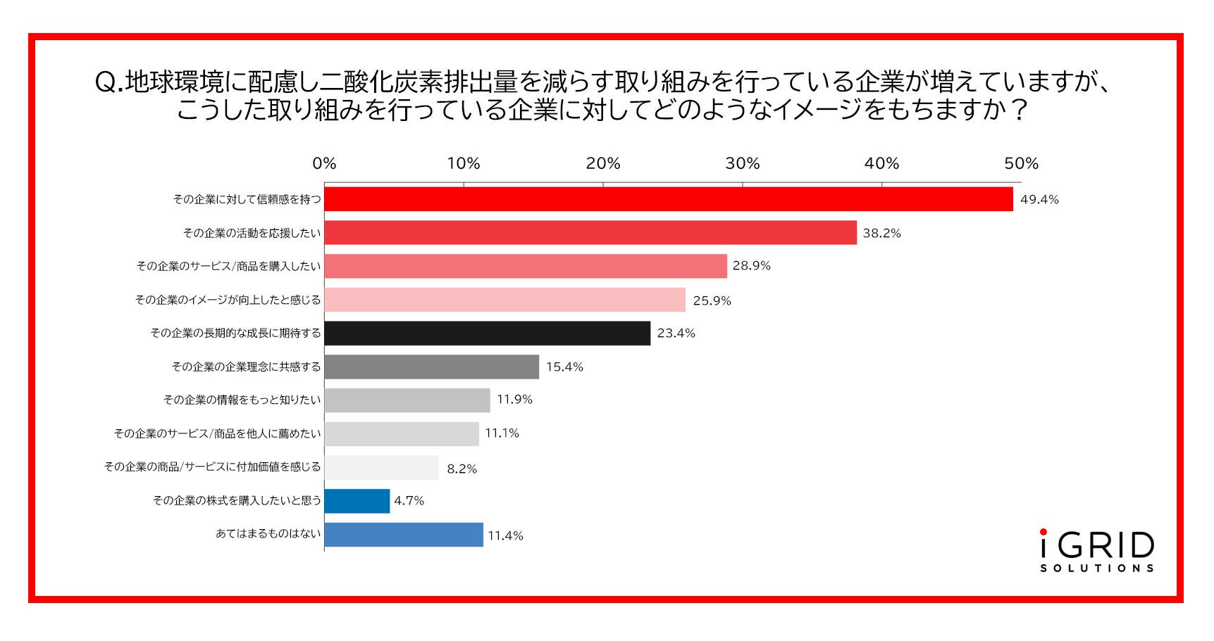 「地球環境に配慮し二酸化炭素排出量を減らす取り組みを行っている企業が増えていますが、こうした取り組みを行っている企業に対してどのようなイメージをもちますか」との質問に対して、「その企業に対して信頼感を持つ」が49.4%、「その企業の活動を応援したい」が38.2%となりました。