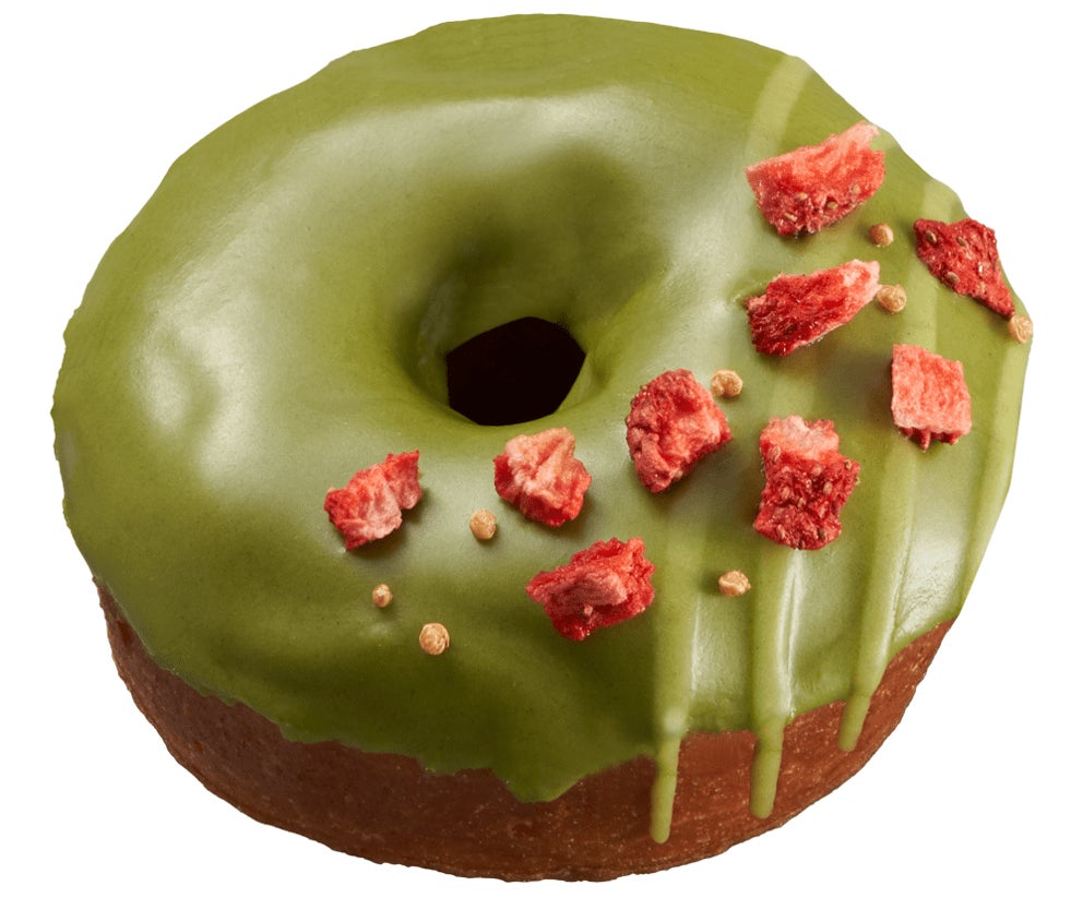オーガニック抹茶で作った濃厚手作りグレーズに、淡い抹茶グレーズとフリーズドライのストロベリーをトッピングした春を感じる春季限定ドーナツです。