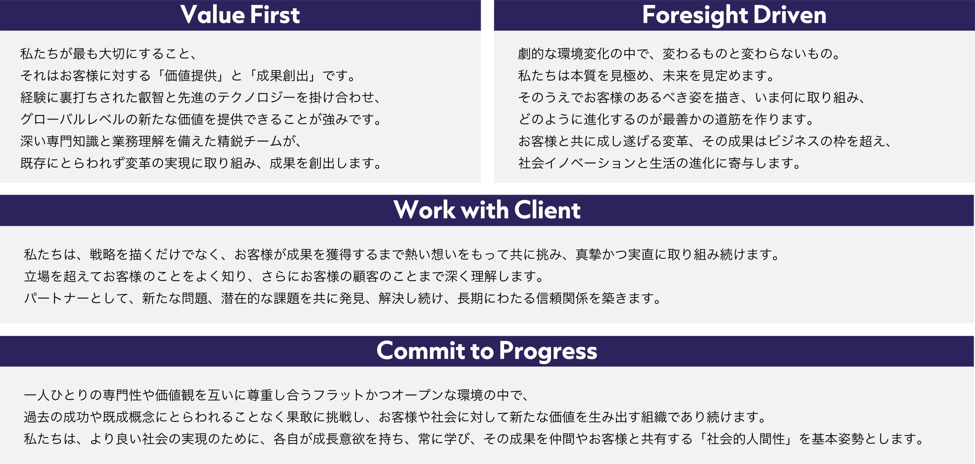 社会のあるべき姿を提示し、変えるべきもの・変えてはならないものを見極め、その実現を支援する、コンサルティング本来のサービスを追求していかなければならないという私たちの明確なコミットメントです。