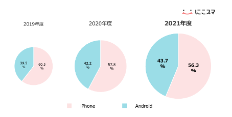 ✔ 内訳はiPhoneが56.3%、Android43.7%で、中古スマートフォン市場でも日本のiPhone人気は顕在も、トレンドとしては年々iPhoneのシェアが下がっている
