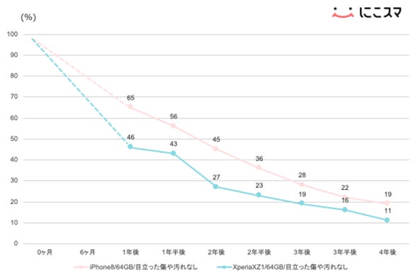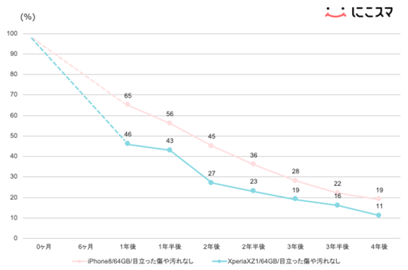 ② iPhone 8とXperia XZ1のフリマ市場での取引価格推移