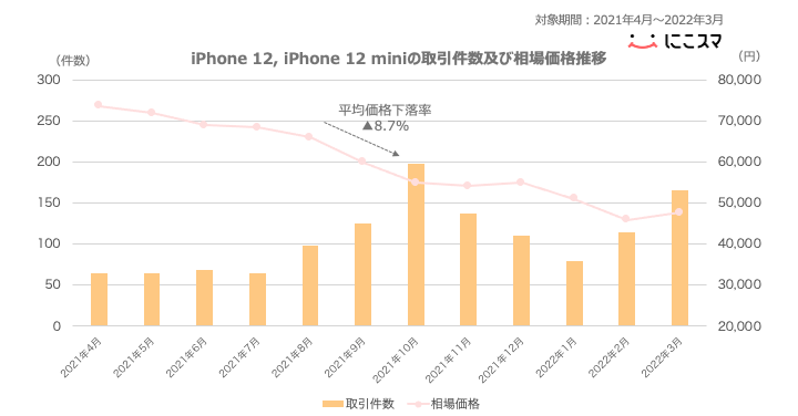※iPhone 12,iPhone 12 mini/64GB/目立った傷や汚れなしの取引件数及び相場価格推移を調査