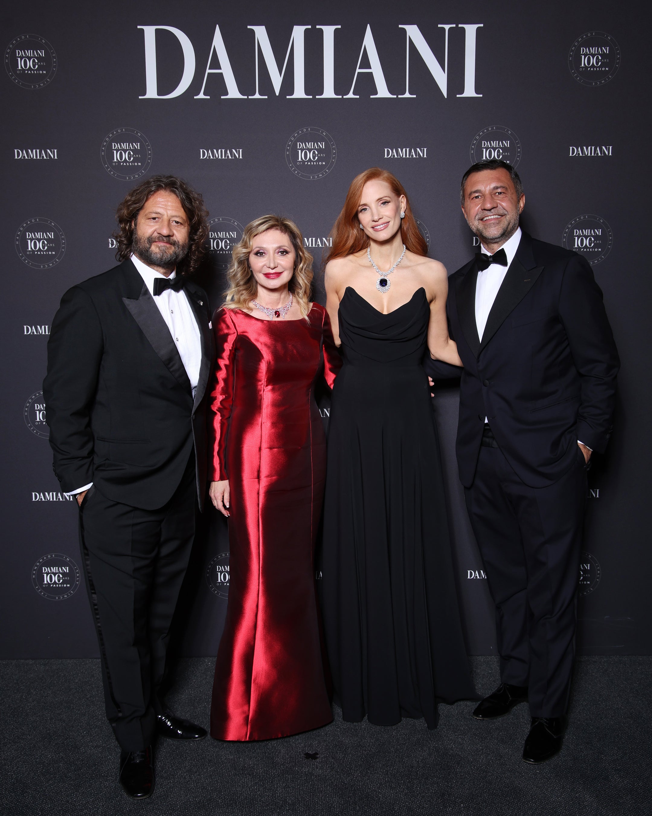 ジェシカ・チャステインと創業者ファミリーで3代目、現ダミアーニ・グループ副社長 兼 ヴェニーニ代表取締役社長のシルヴィア・ダミアーニとの出会いは、ジェシカがダミアーニ・グループが所有するムラーノ島のガラスメーカー、ヴェニーニを訪れたときだった。それ以来、ダミアーニ一族と彼女の関係は自然に発展し、深まり、ジェシカは3月14日にミラノで開催されたダミアーニの創業100周年を祝うガラ イベントの主賓を務めた。