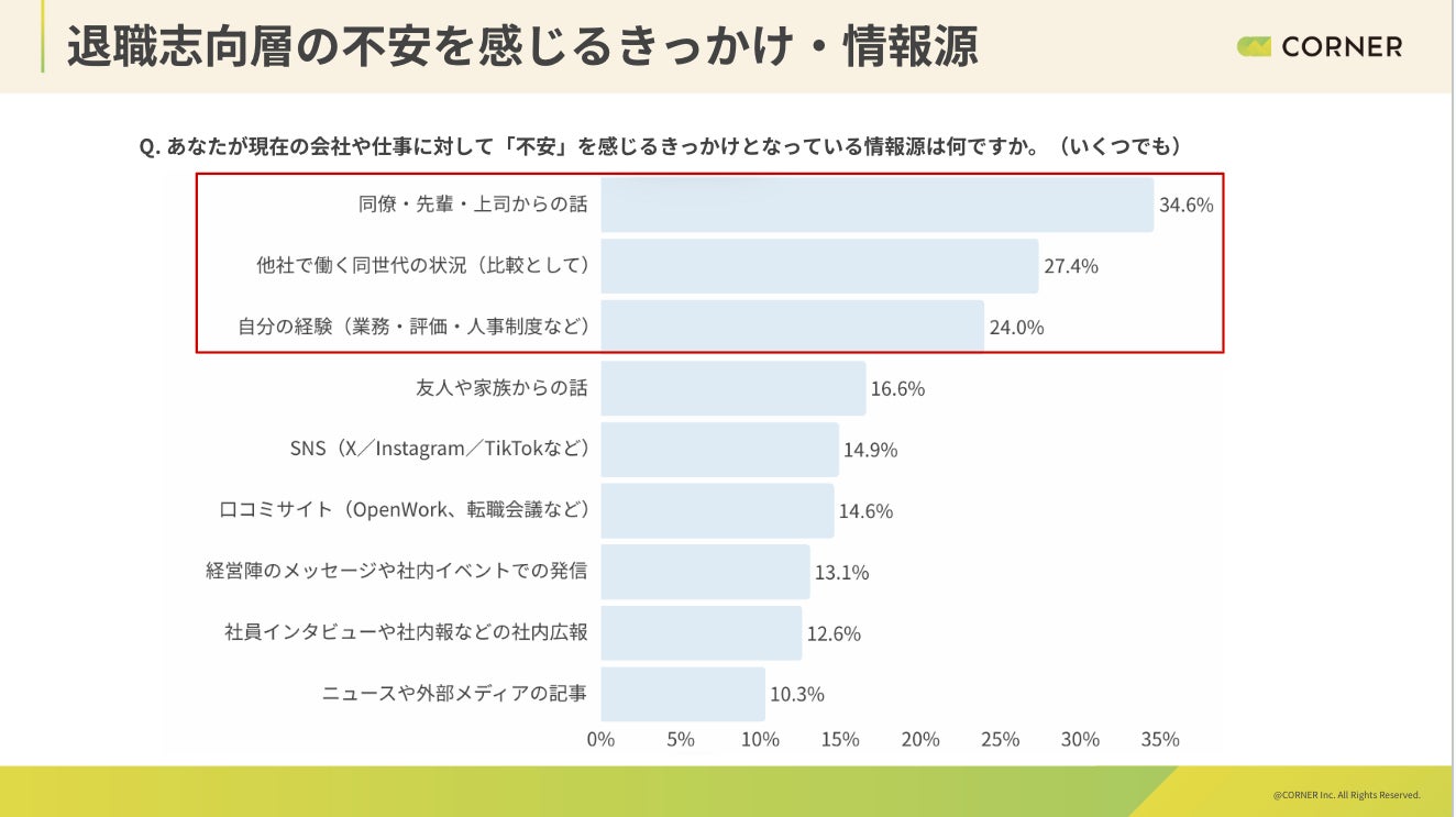 上記の不満が、どの情報に触れると強まるのかを尋ねる設問では、「同僚・先輩・上司からの話」が34.6%で最多となっている。