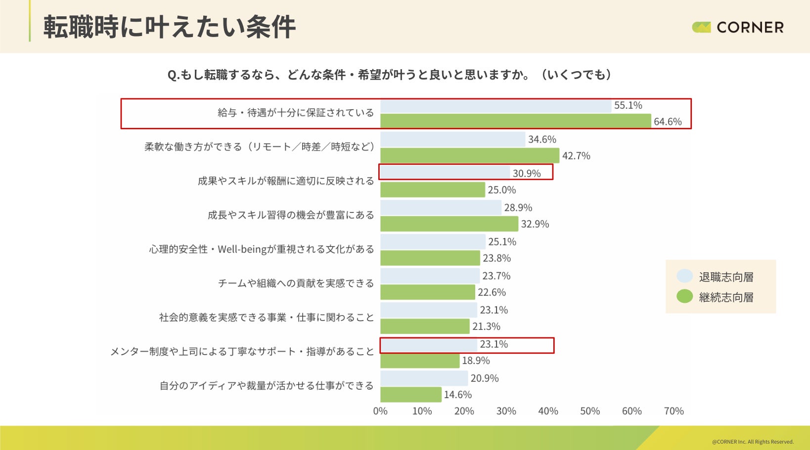 最後に、こうした認識が転職行動の条件選好にどのように表出しているかを確認したところ、両層とも最多は「給与・待遇が十分に保証されている」で、退職志向層55.1%、継続志向層64.6%となっている。継続志向層は働き方・育成も相対的に重視し、退職志向層は成果・スキルの報酬反映や裁量など、やりがいを求める傾向にあり、メンター制度や上司によるサポートへのニーズも相対的に高い。