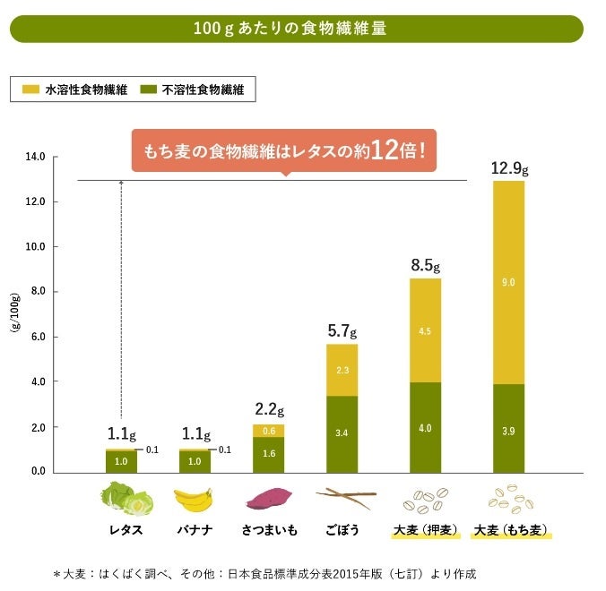 - 「もち麦」を含む大麦は、不溶性食物繊維と水溶性食物繊維のバランスが良い。