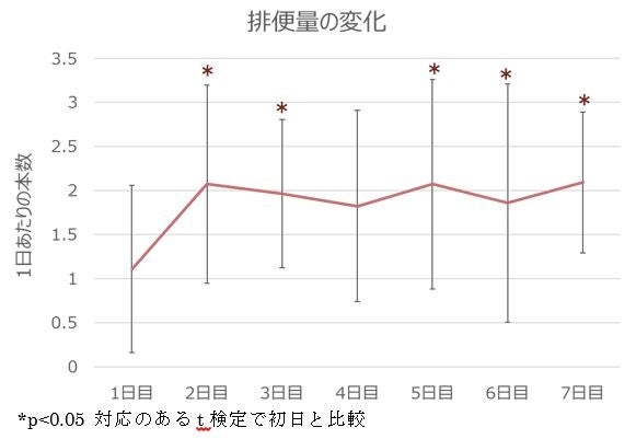 ・もち麦ごはん摂取1~7日目までの1日あたりの便の本数を確認したところ、対象者全体において1日目と比較して2日目から排便量が有意に増加した(n=14、4日目を除く)。