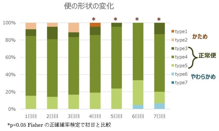 ・もち麦ごはん摂取1~7日目までの便の形状を確認したところ、対象者全体において1日目と比較して4日目から便の形状が有意に変化した(n=14)。
