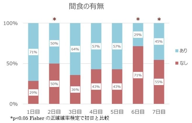 ・事前アンケートでは、毎日1回以上間食する人が71%(摂取1日目と同じ)だったが、最終日には半数以上の人が間食しなかった。