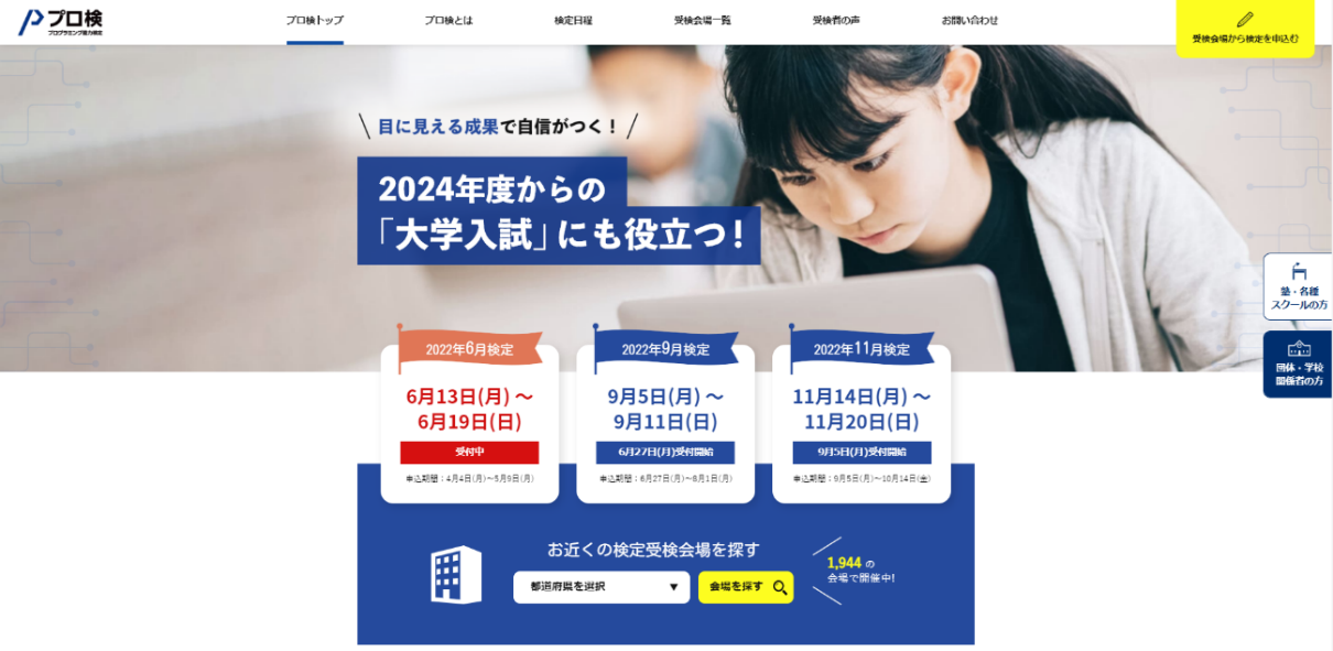 2020年12月にスタートしたプロ検は、主旨にご賛同いただいたプログラミングスクール、学習塾、パソコン教室、学校、学童など、多様な教育機関にて実施されており、子ども達のプログラミング学習への意欲喚起や学習継続のきっかけとして、また、受検者や教育者が個人のプログラミング能力・技能を可視化した上で、効果的な学習・指導に繋げることができるツールとして活用されています。