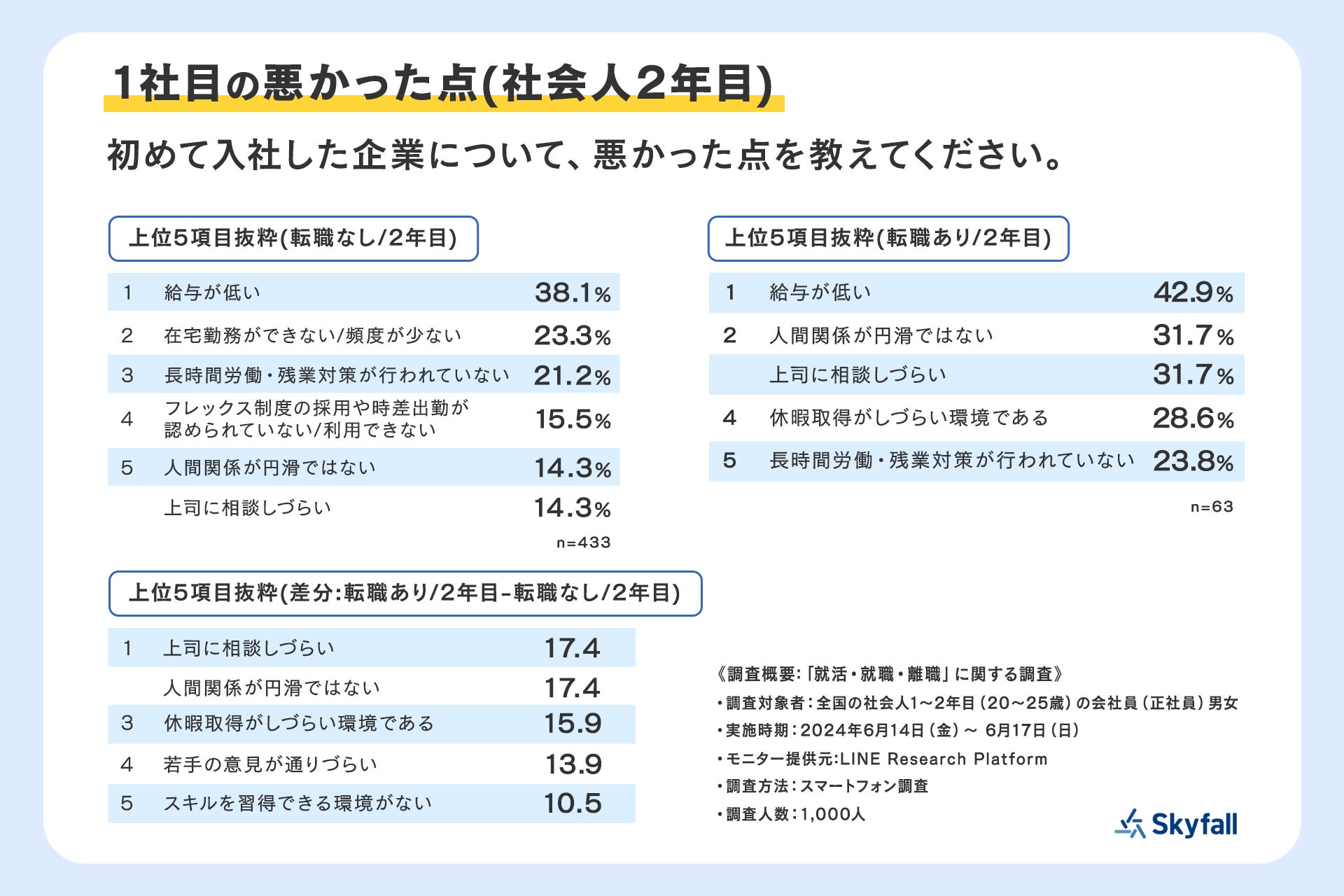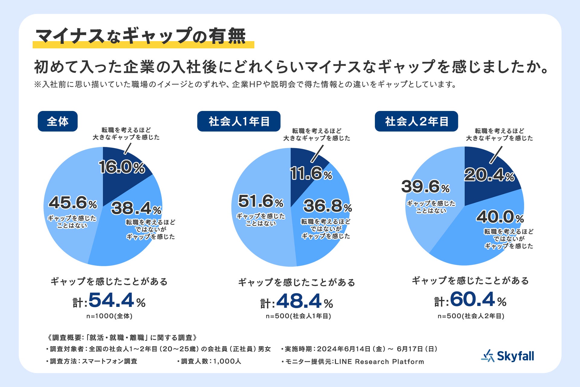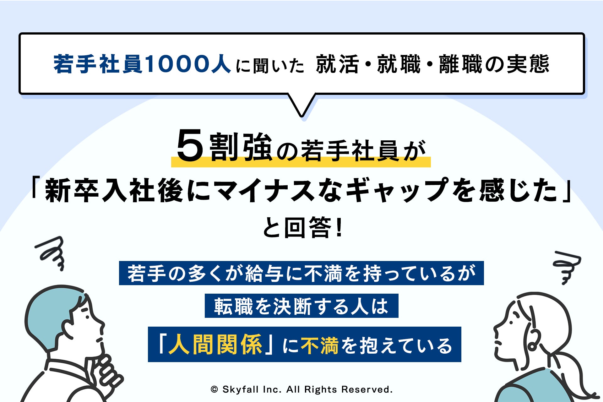 【Skyfall調査レポート】社会人1~2年目を対象とした「就活・就職・離職に関する調査」の結果を発表。5割強の若手社員が新卒入社後にマイナスなギャップを感じたと回答。
