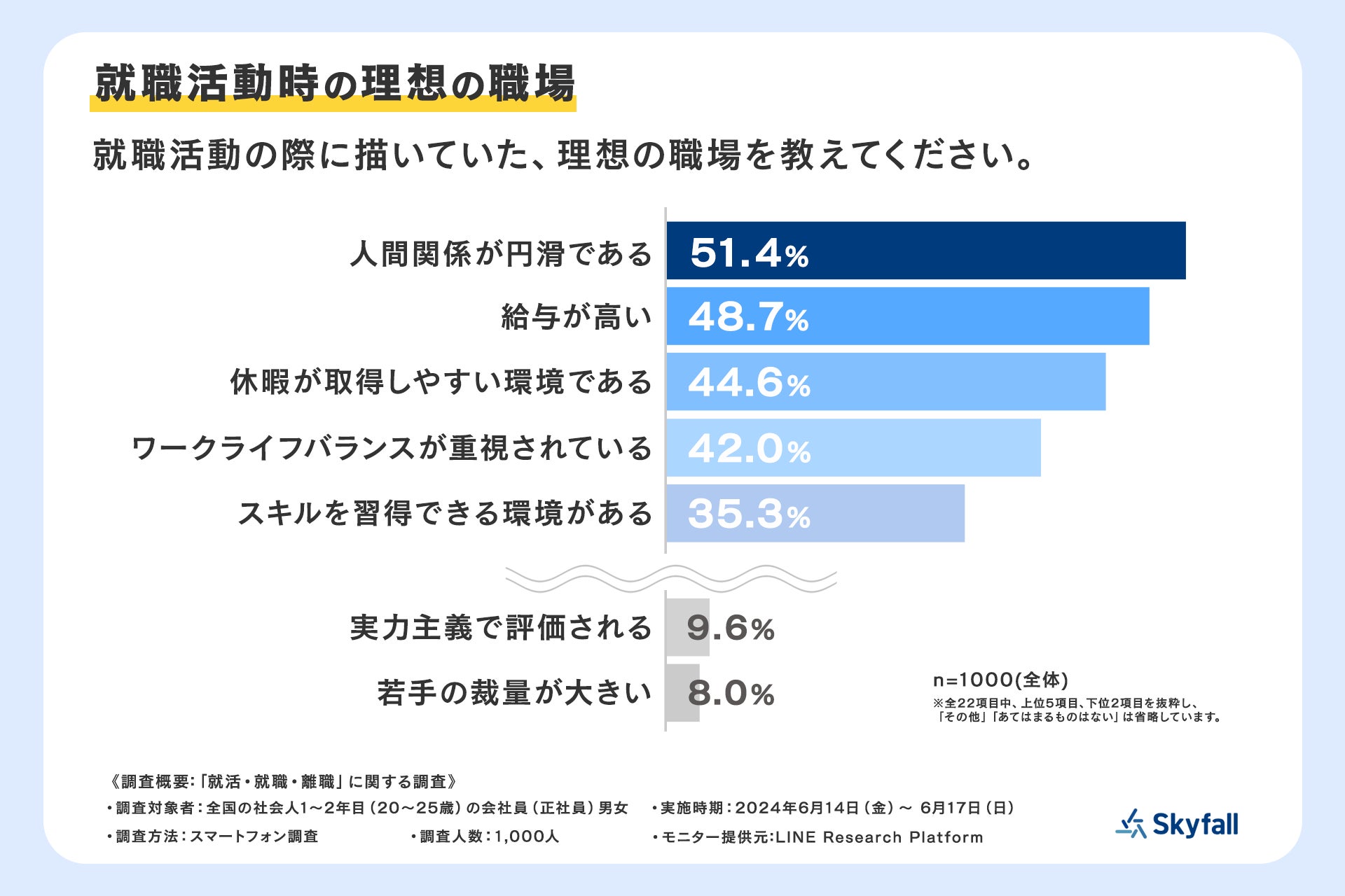 就活中に思い描いていた理想の職場は、「給与が高い」や「休暇取得がしやすい環境」を抜いて、「人間関係が円滑である」が51.4%で最多に