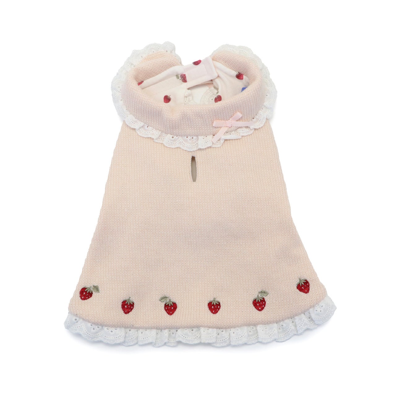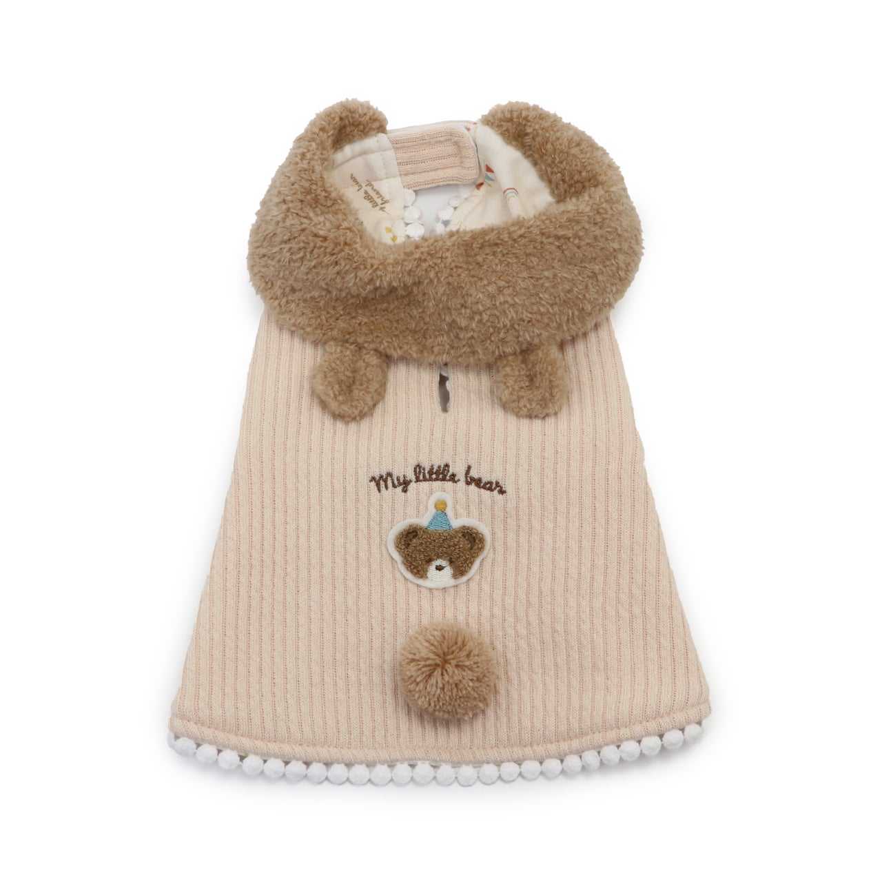 頭を通さず着せやすい背開き形状。ワンちゃんの肌に当たる内生地は綿100%です。