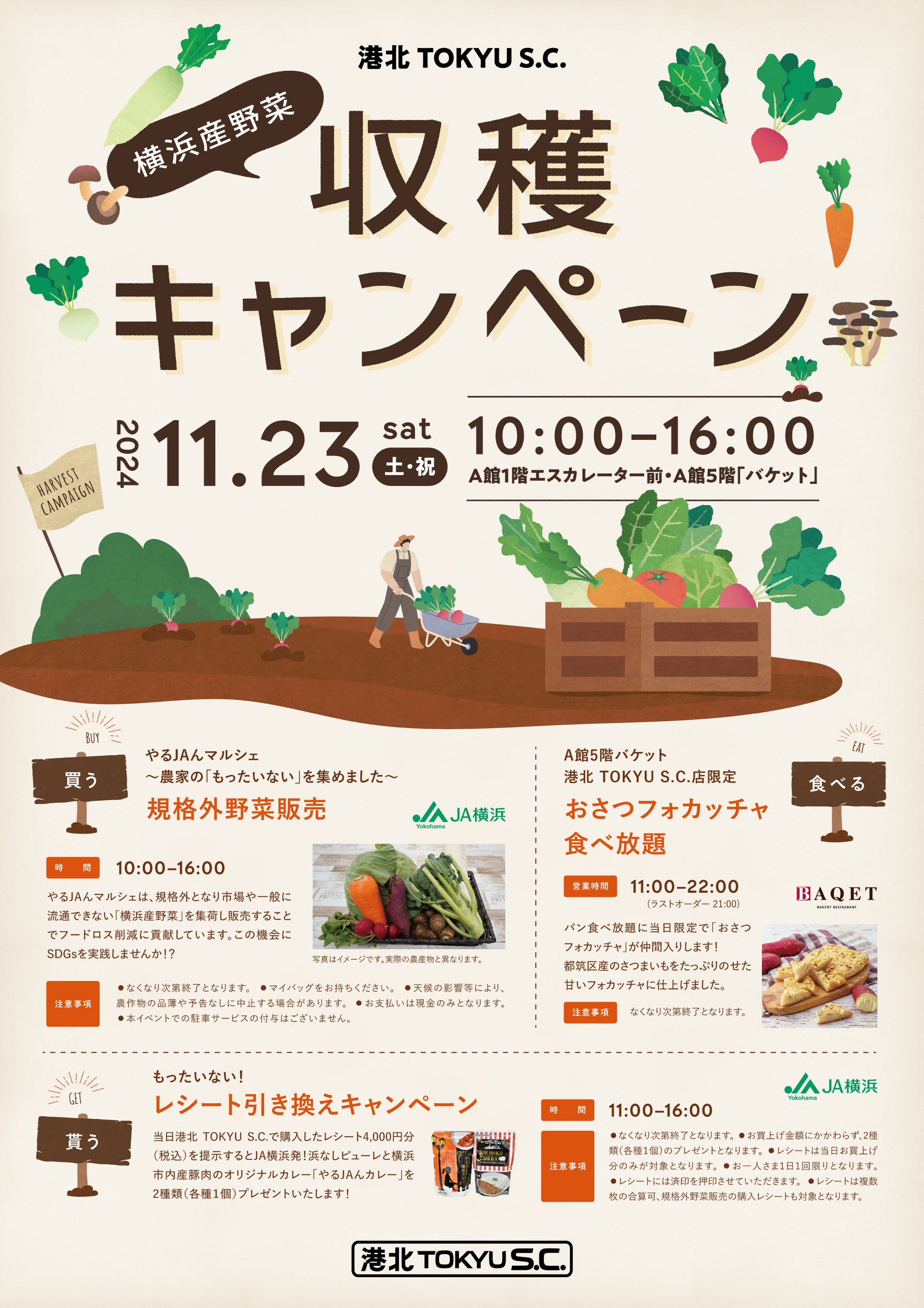 当施設は、地域の皆さまが、横浜で生産される野菜の魅力を知り普段の食事に取り入れるきっかけを提供したいという思いから、本イベントを企画しました。A館5階に出店するベーカリーレストラン<バケット>では、港北 TOKYU S.C.店限定でメニュー開発した、JA横浜から仕入れた都筑区産のさつまいもをふんだんに使用した「おさつフォカッチャ」を提供し、横浜の旬の味覚を味わうことができます。また、当日当施設内にて購入したレシートの提示で、横浜産の食材を利用したJA横浜のオリジナルレトルトカレー「やるJAんカレー」2種類をプレゼント。さらに、2024年6月に開催し好評だったJA横浜による規格外野菜の販売を行う「やるJAんマルシェ」も開催し、地元で生産される野菜のロス削減を図ります。