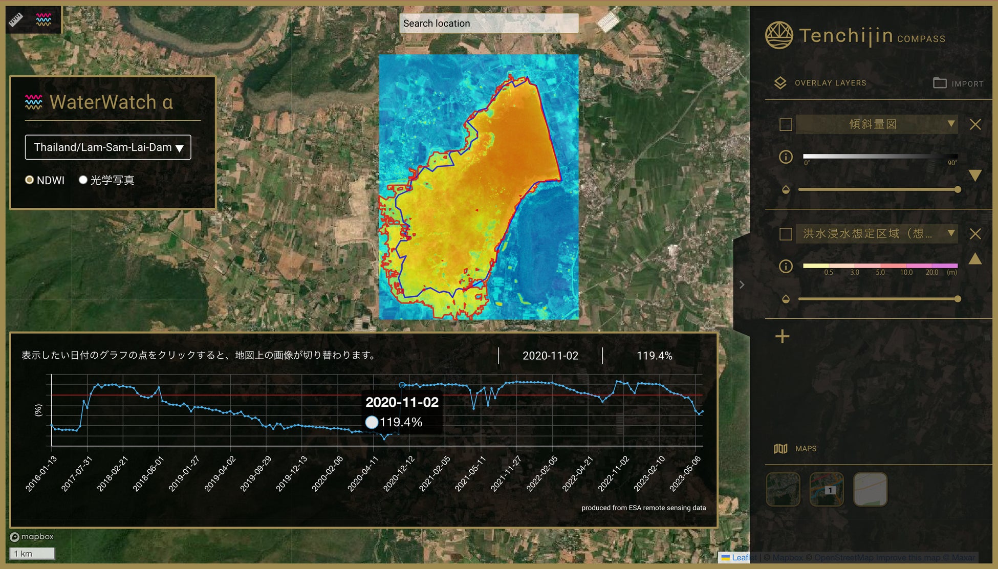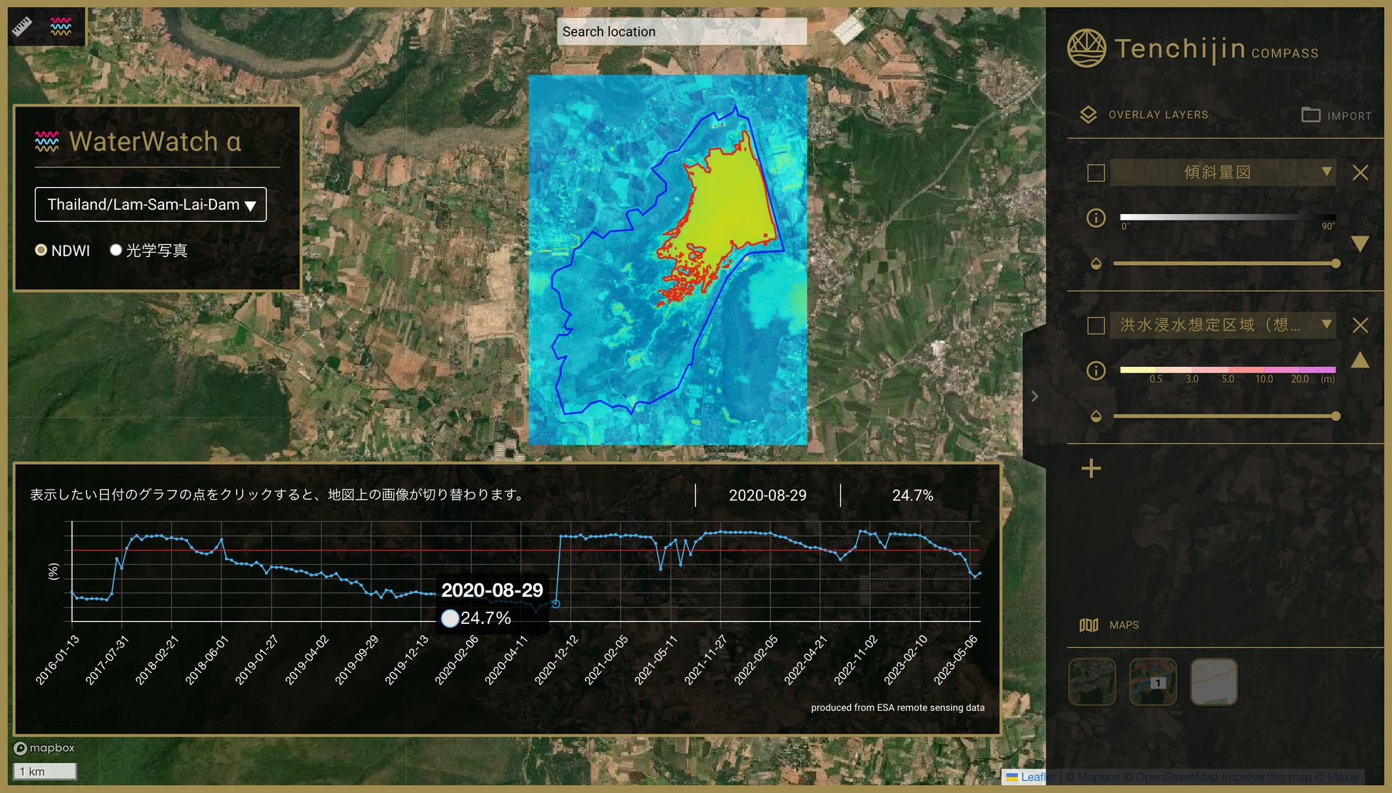 ダムや、河川、湖、貯水池の分析に。水域の変化を表すデータから土地を評価できるWebGISサービス『天地人コンパス WaterWatch α』を開発。アカウント登録の必要なく無料で利用可能