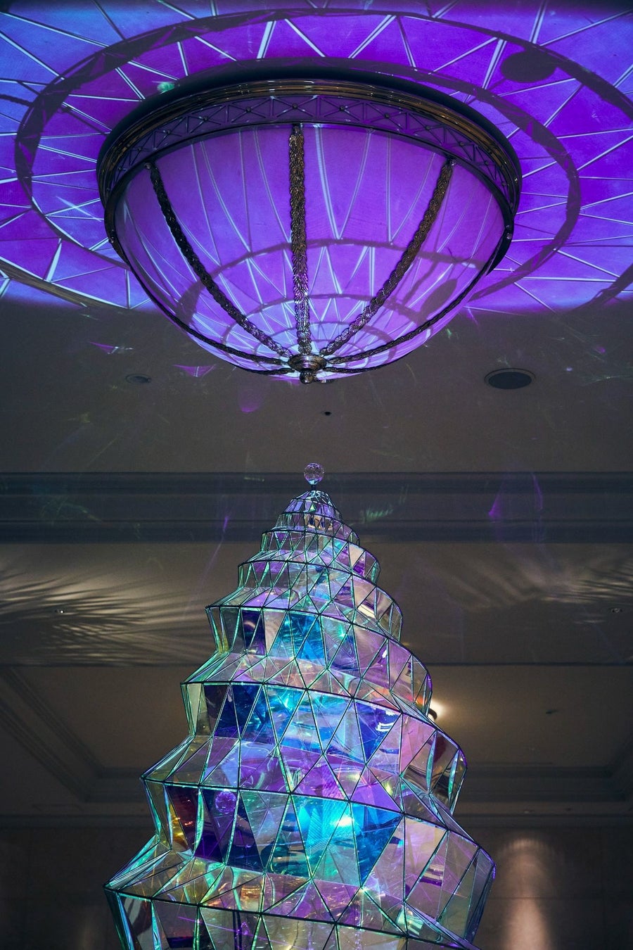 【内容】 名古屋マリオットアソシアホテルに、虹色にきらめくツリーが登場。ツリーの中には美しく輝くクリスタルガラス・スワロフスキーをあしらい、投影された光の反射・屈折によってさまざまな表情を織り成します。クリスタルをかたどった宝石のような造形は、祈りや未来への希望を表現しました。夜明けとともに訪れる輝かしい未来に向けて、人々の幸せへの願いを込めたツリーです。