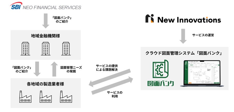 株式会社New Innovations(本社:東京都江東区、代表取締役CEO兼CTO:中尾 渓人、以下「New Innovations」)は、SBIネオファイナンシャルサービシーズ株式会社(代表取締役:吉木直道、以下「SBI NFS」SBIホールディングス株式会社の100%子会社)と業務提携契約を締結しました。本提携によりNew Innovations は、SBI NFSが持つ地域金融機関ネットワークを通じて、AIを活用した製造業向けクラウド図面管理システム「図面バンク」を提案することが可能になります。