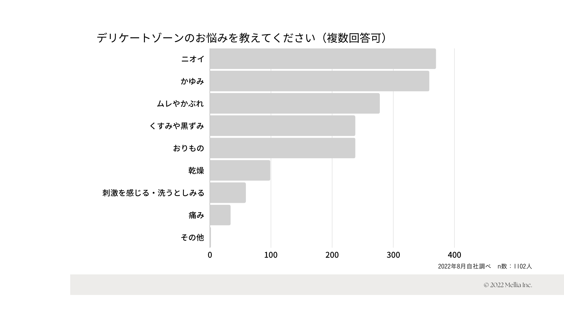 乾燥やホルモンバランスの揺らぎなどの理由から菌が原因となり発生する、「いやなニオイ」。過去に自社で実施したデリケートゾーンのお悩みに関する調査で最も多かったお悩みが、「ニオイ」でした。