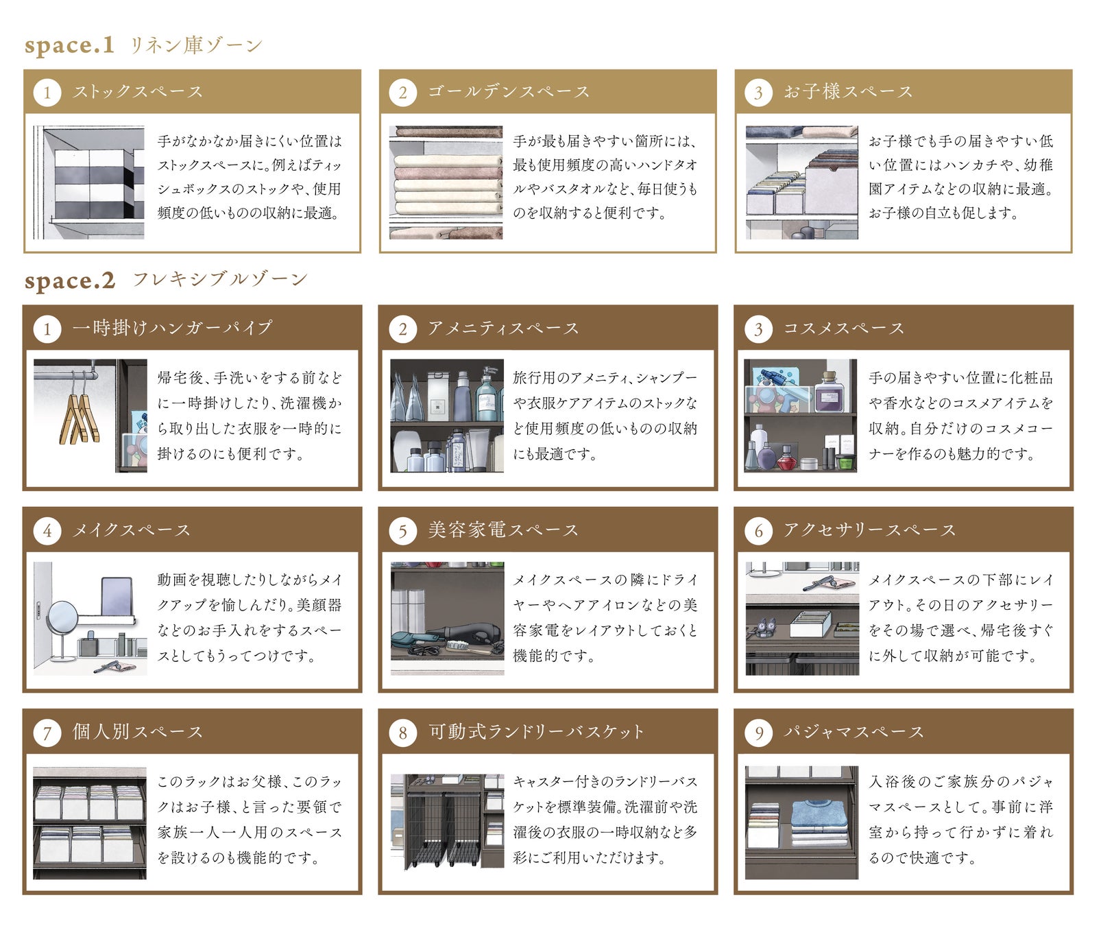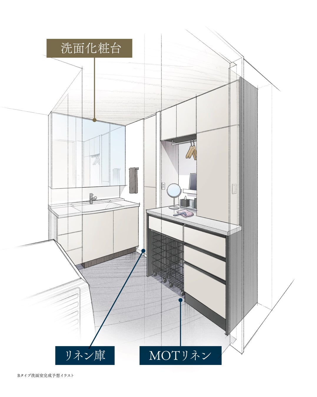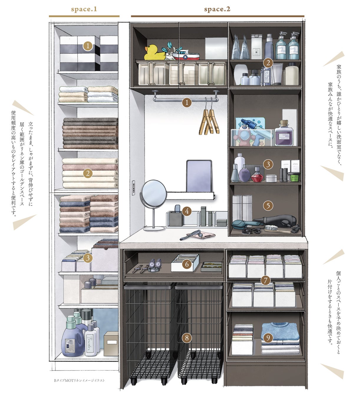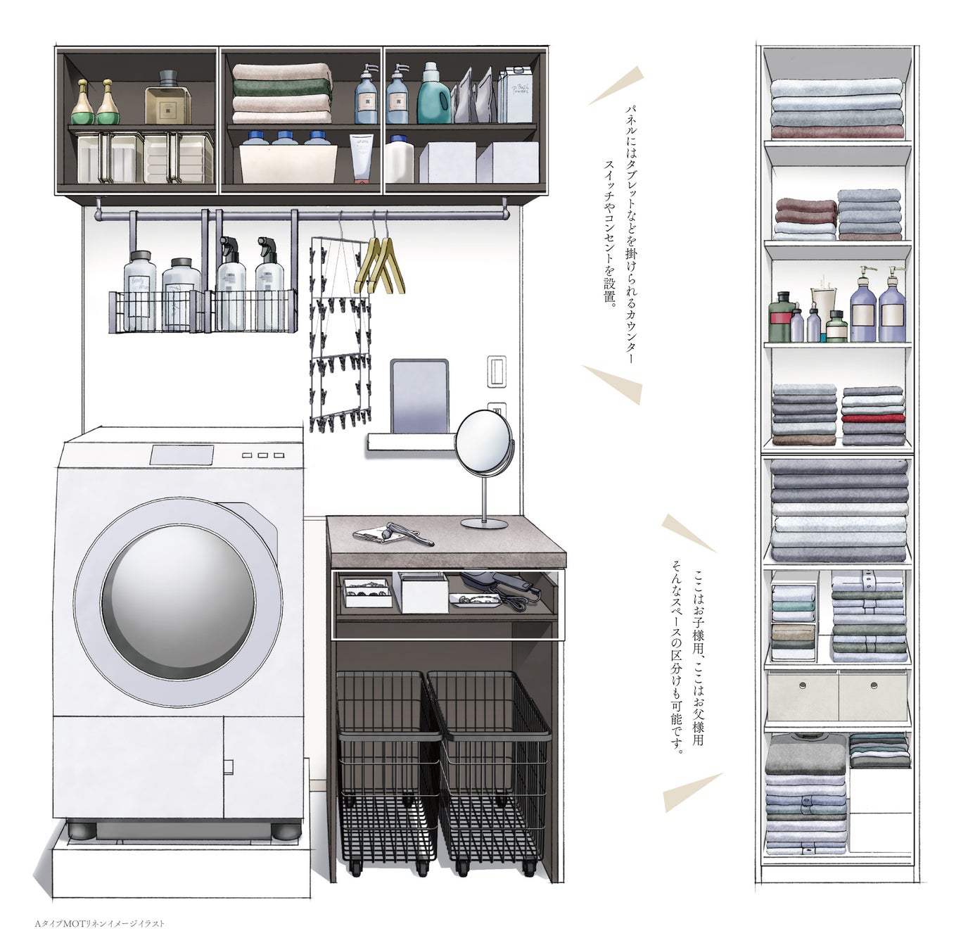 『MOTリネン』は、洗濯物を乾燥機から取り出してその場で畳んで、その場で収納できるようにすることで、家事の効率化を図りました。また、リネン庫の収納力を大幅に向上させたことに加え、洗濯物を畳んだり、美容家電を置いてお肌のお手入れやメイクをするなど、様々な使い方ができるカウンターを備えた空間です。リネンスペースには、吊戸棚、縦型収納、引き出し、ハンガーパイプなど様々な形状の収納スペースを備えました。ご家族のライフスタイルや一人ひとりの身長などを踏まえて収納するものをレイアウトすることで、機能的にご利用いただけます。