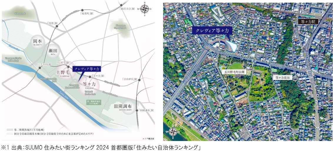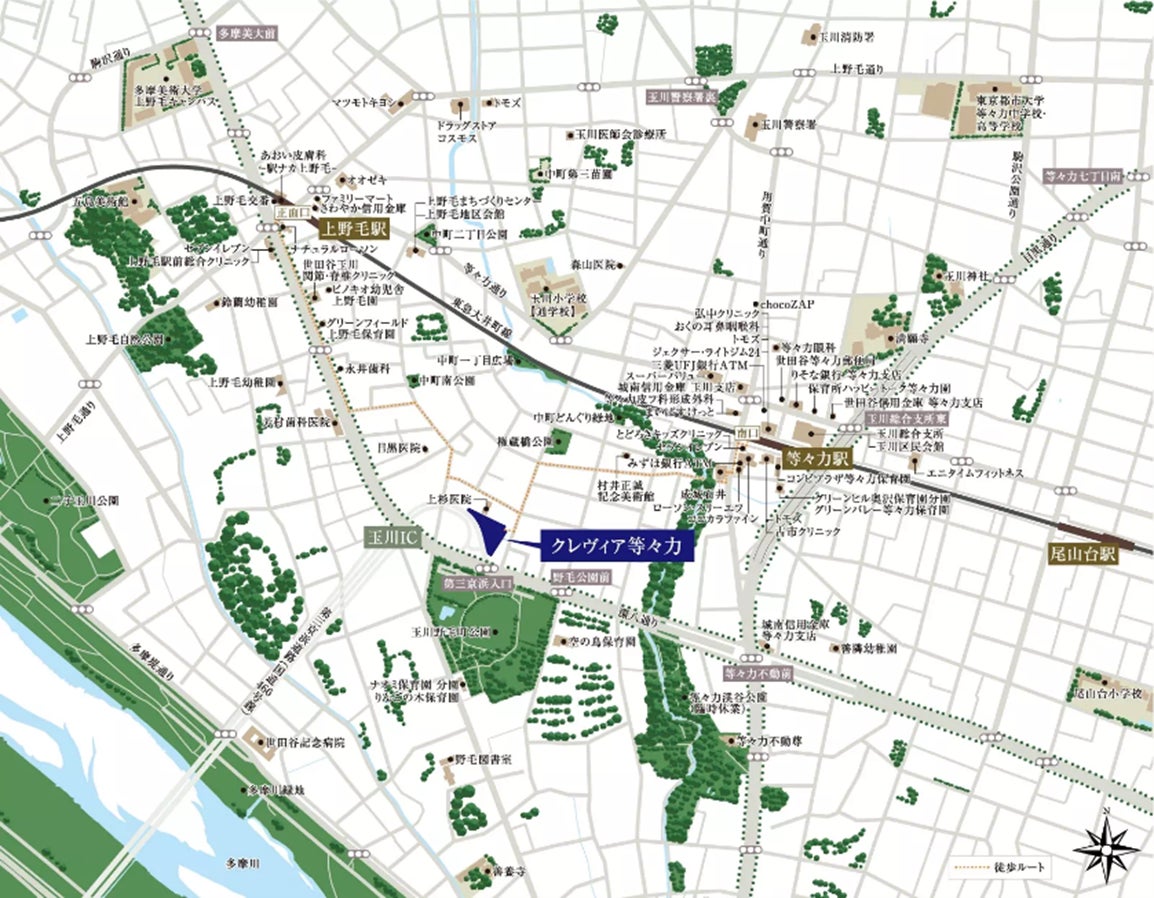 「クレヴィア等々力」は、東急大井町線「等々力」駅徒歩8分、等々力渓谷を抜けた先に位置しています。等々力は、等々力渓谷や多摩川など自然豊かな環境でありながら、二子玉川や自由が丘も近く、国分寺崖線の高台に並ぶ邸宅街として人気のエリアです。本物件が立地する地域は、自然景観を保全する第二種風致地区に指定されており、また、将来的にも良好な住環境が守られる第一種低層住居専用地域にも位置付けられています。