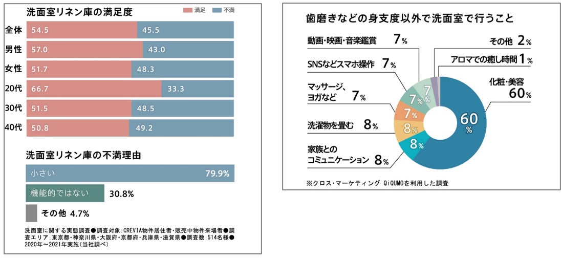 当社が実施した「洗面室に関する調査」では、「洗面室が狭い」「収納が不足している」「収納の奥行きが足りない」などの声が多く寄せられ、洗面室に何らかの不満を抱いていることが分かりました。