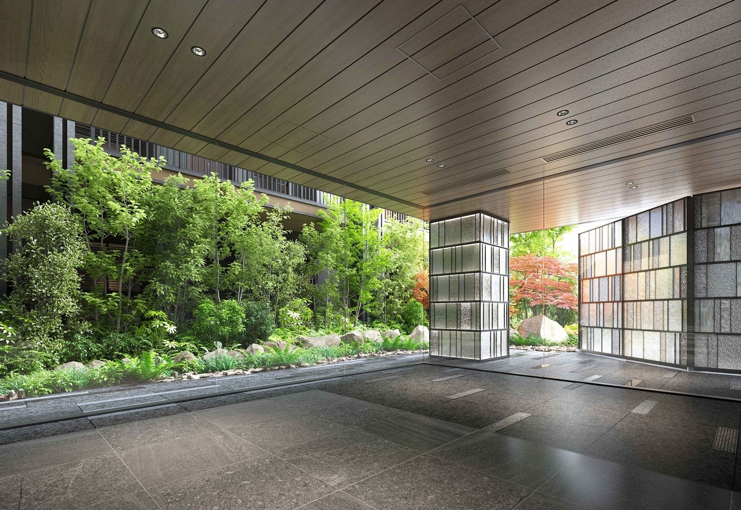 本物件は、等々力渓谷が近くにある立地特性から、デザインは「等々力渓谷に佇む邸宅」をイメージし、吹き抜ける爽やかな風、湿潤な渓谷の神秘性、四季の彩りをテーマに、建物のフォルムや素材、色調などを計画しました。外部から護られた“別世界の邸宅”を目指した敷地内には、植栽スペースを広く確保。全ての1階住戸には、ゆとりのある専用庭があり、戸建感覚でガーデンライフを楽しめます。植栽計画の監修には、オリエンタルランドグループの(株)グリーンアンドアーツを起用し、屋内外の境界を忘れるほどの緑鮮やかな庭園風景を創造しました。