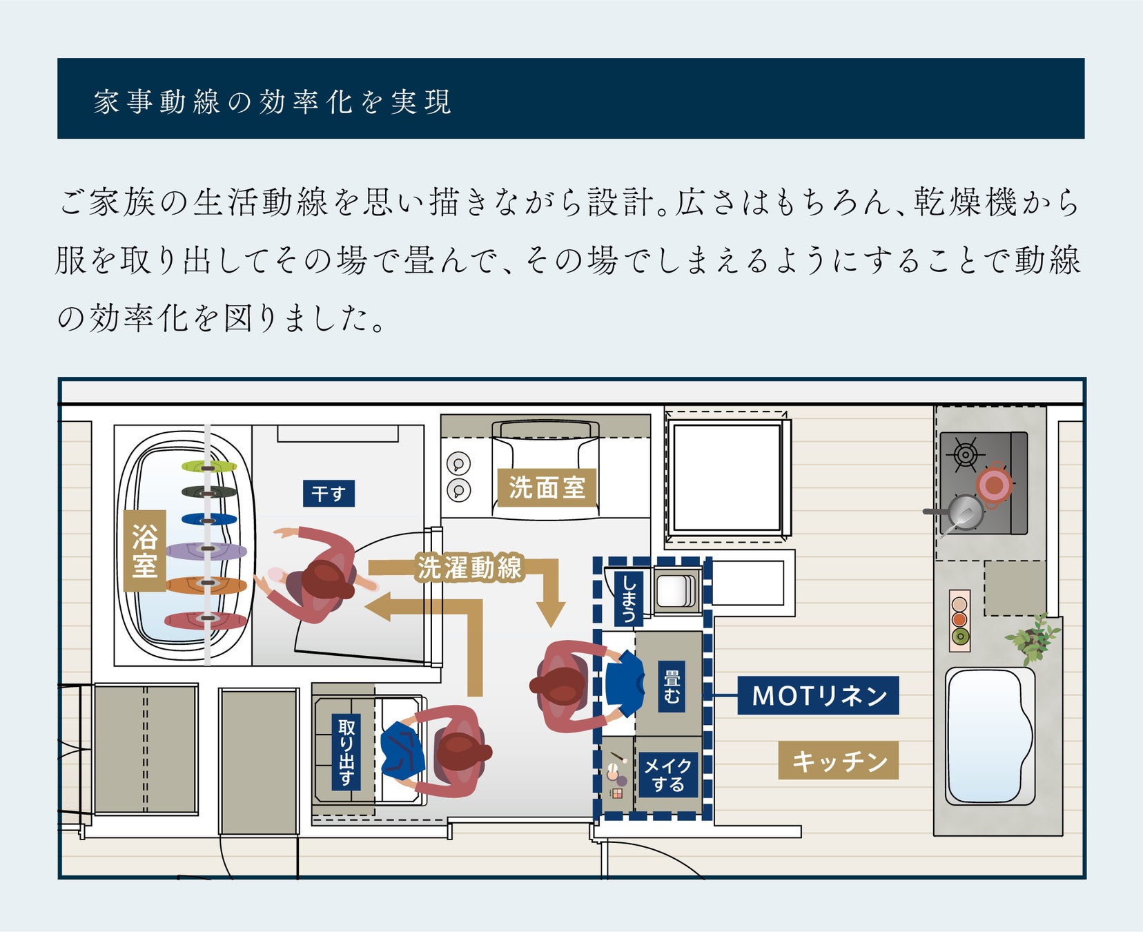 アンケートでは、従来の洗面室における洗濯時の不満な点として、「洗濯してからクロゼットへ収納するまでの動線の効率が悪い」と感じている方が多数いらっしゃることがわかりました。社内で議論を重ねた結果、洗濯後の動きとして、[洗濯機から洗濯物を取り出すバルコニーや浴室乾燥機で乾かす→リビングに運びソファで畳む→家族各々のクロゼットに収納する] と対応されている方が多く、洗濯から収納まで家の中を行き来する距離が長いことが不満に繋がっているのではないかという結論に至り、その不満を解消するべく『MOTリネン』を計画しました。乾燥機から取り出した洗濯物をリネンスペースのカウンターで畳み、クロゼットへ収納するという動線で設計し、家の中を行き来する距離をできるだけ短縮することで効率化を図りました。また、『MOTリネン』内にパジャマや肌着などの収納スペースを確保することで、カウンターで畳んだものをその場で収納でき、より一層家事の時短に繋がります。