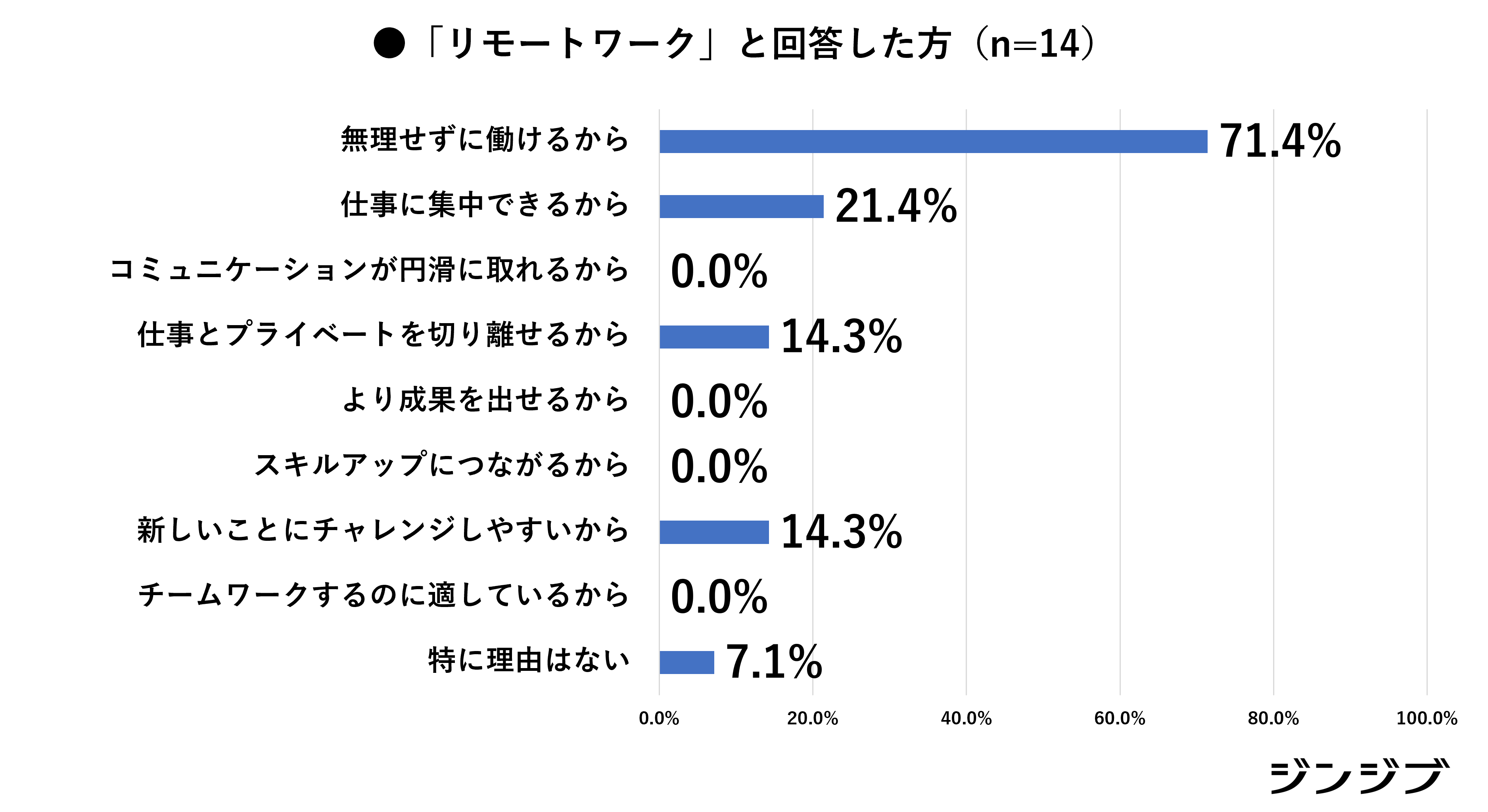 理想の働き方に関する質問で「リモートワーク」と回答した方の7割以上の方が「無理せずに働けるから」と回答しました。