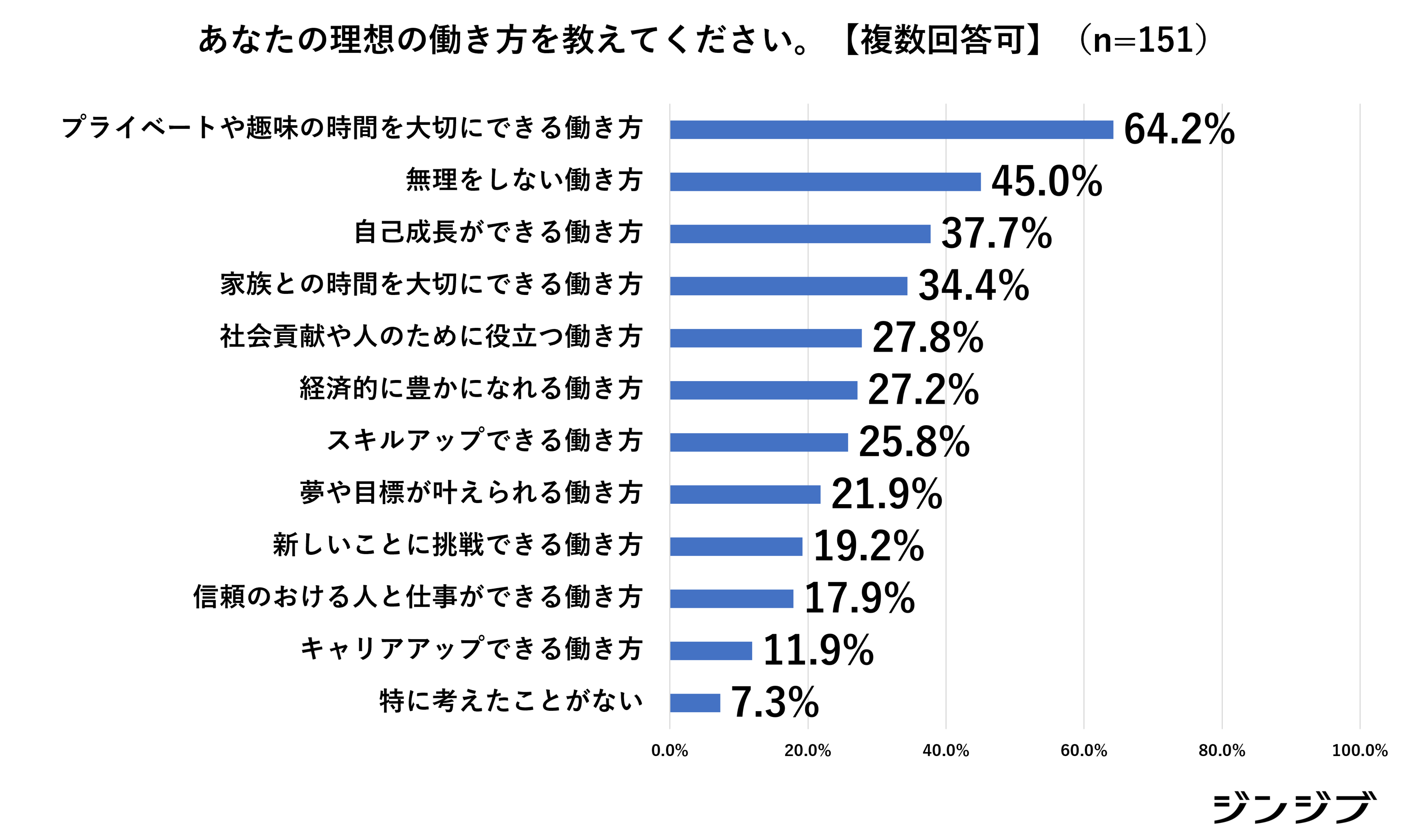 理想の働き方「プライベートや趣味の時間を大切にできる働き方」64.2%に次いで「無理をしない働き方」が45%。