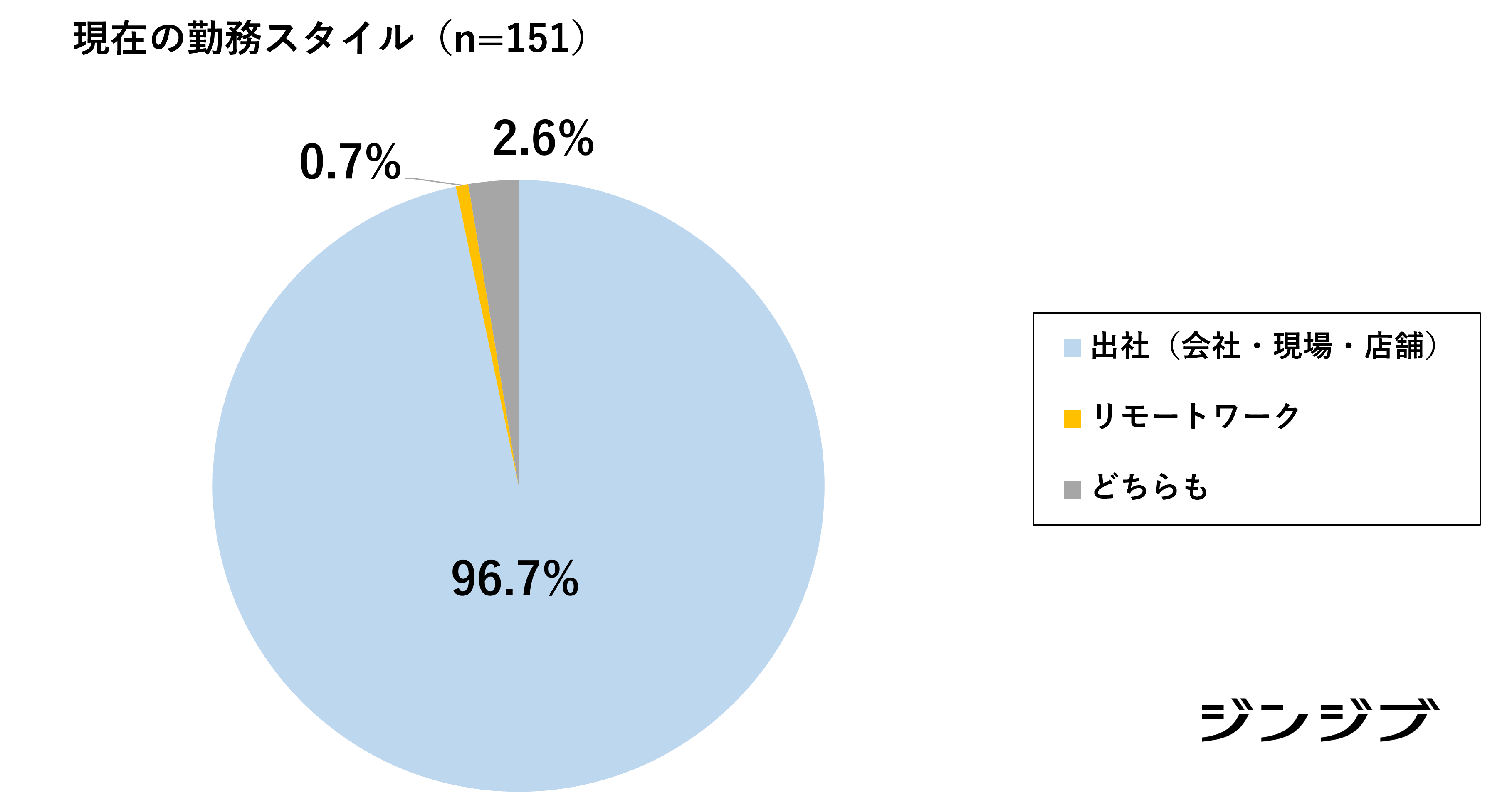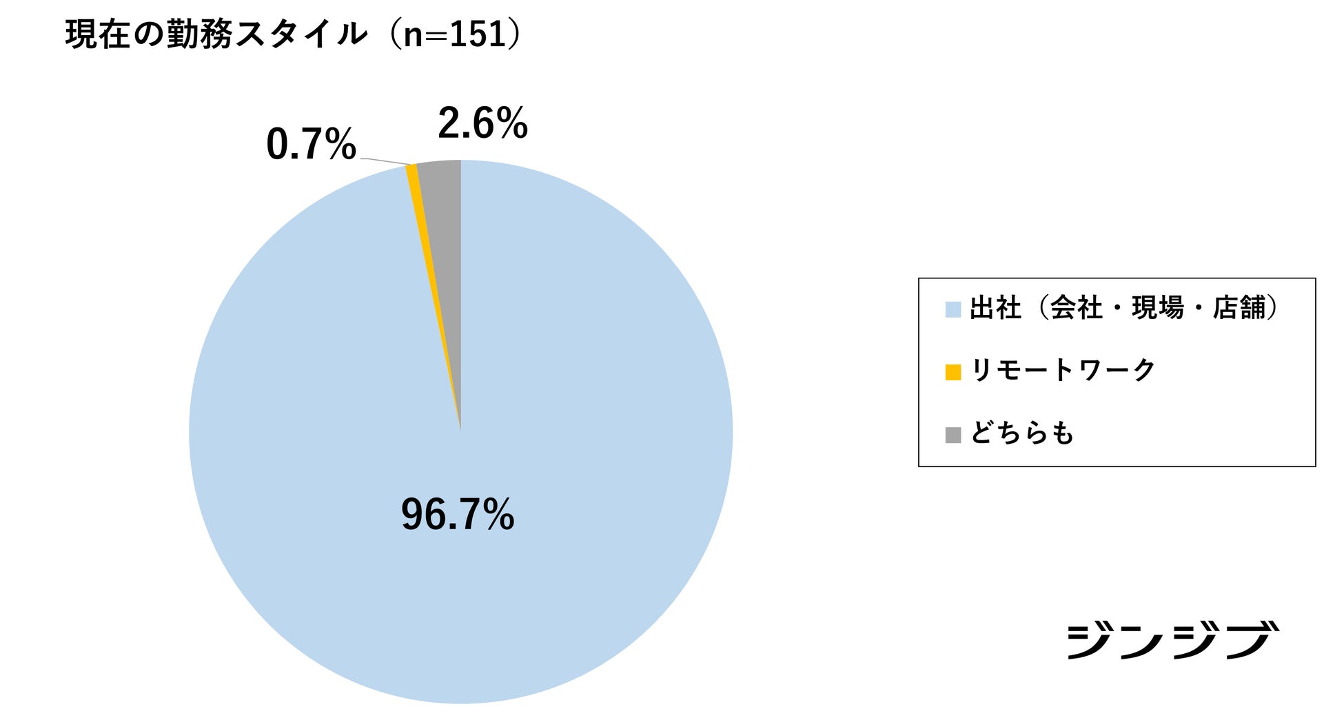 現在の勤務スタイルについて質問したところ「出社」146名、「リモート」1名、「どちらも」が4名と、アンケート回答者の現状の勤務スタイルは「出社」の方が多い結果となりました。最も多かった「出社」と回答した方に理想の働き方についてさらに質問しました。