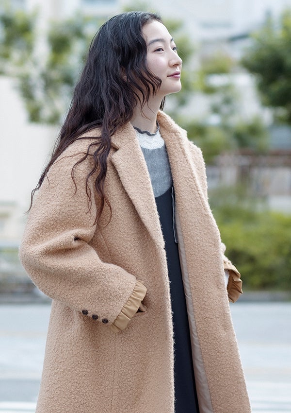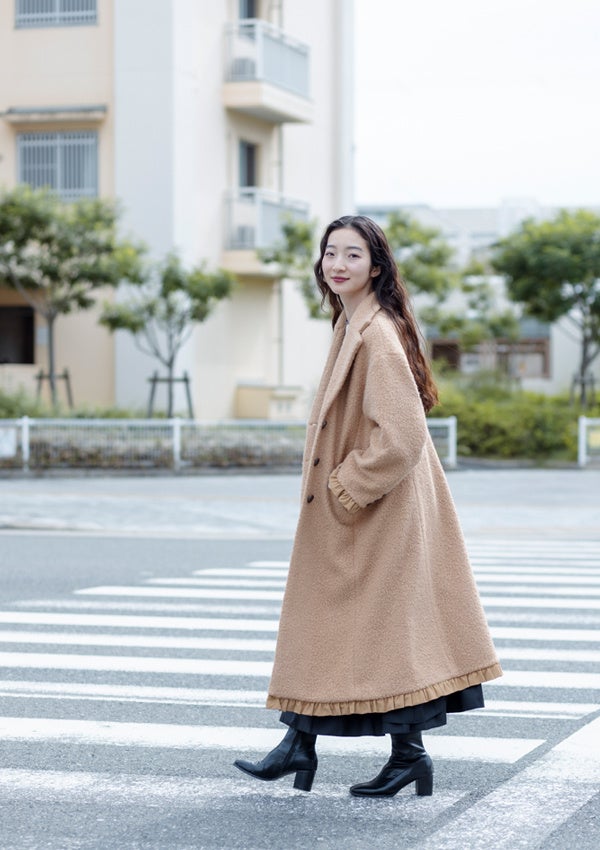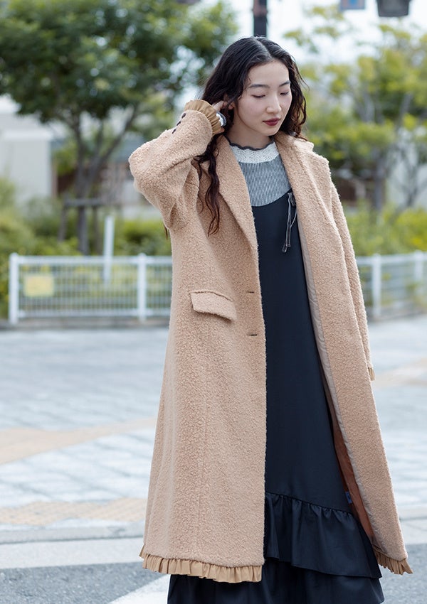 異素材の袖と裾のフリルディテールがポイントのロングコート。くるくるとした毛足のフェイクウール生地で、1枚で主役になるアイテムです。